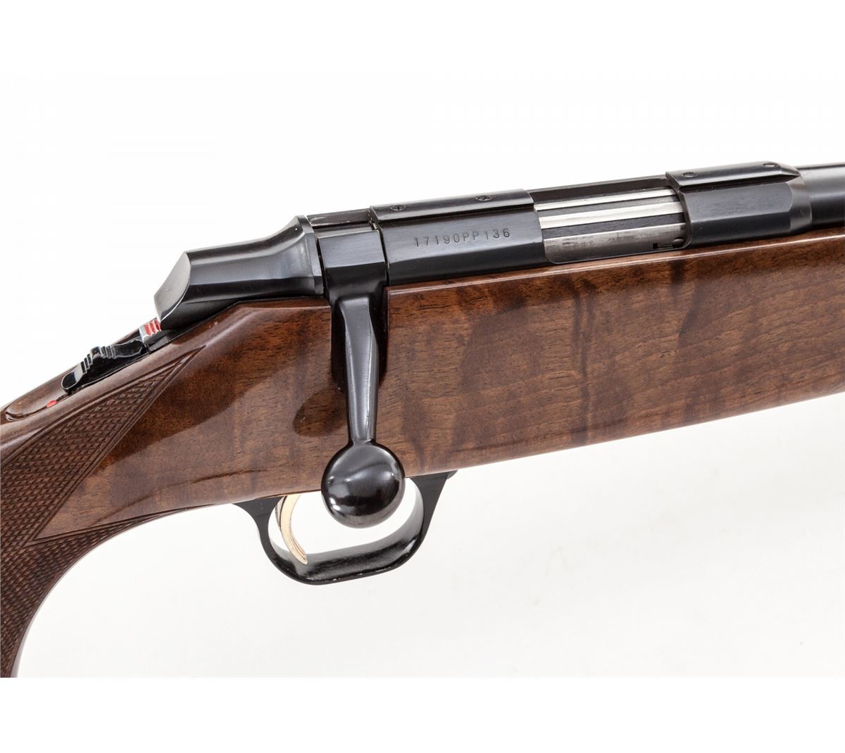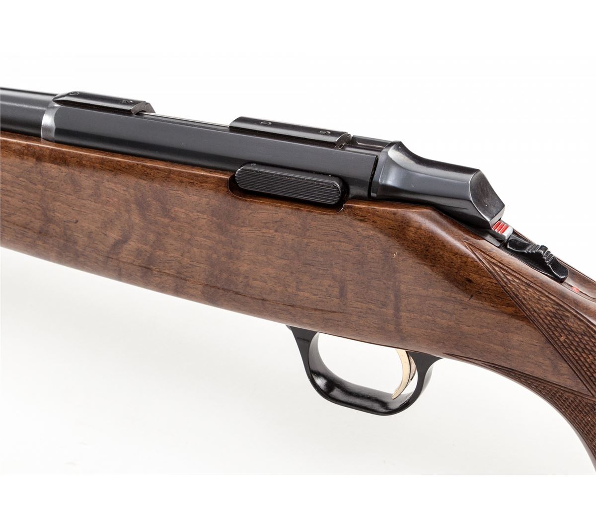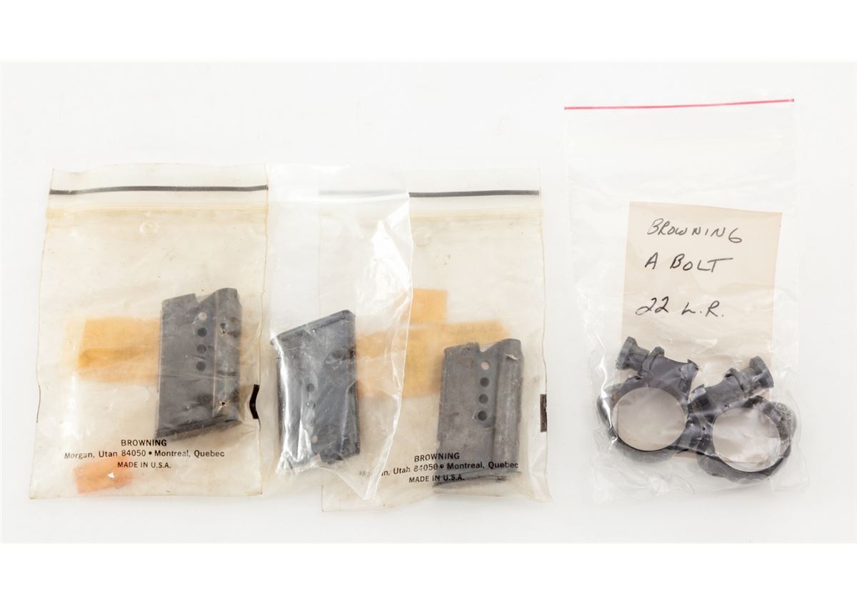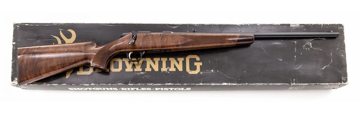 Browning A-Bolt Bolt Action Rilfe, #17190PP136, .22 LR cal., 22'' barrel, blue finish, high gloss checkered pistol-grip walnut stock with rosewood pistol and forend cap, Browning buttplate, folding rear sight, dovetailed bead front sight, four magazines, and un-mounted scope rings, in original box with matching end label. Condition is excellent with light overall marks from handling. Stock with a few minor and one larger impression near forend checkering. Action is crisp, bore is bright. Box shows moderate damage and wear. Est.: $400-$600. (Modern)