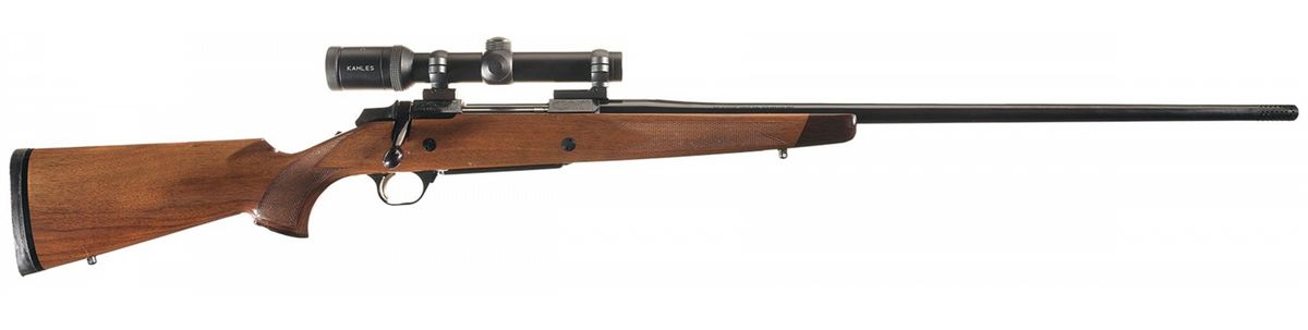 Manufactured in Japan. Ported barrel tapped for a rear sight/scope mounting and equipped with a Kahles 4x42 scope. "MEDALLION" marked floral scroll engraved receiver with the engraving extending to the floor plate. Checkered pistol grip stock with rosewood forend tip and grip cap, sling swivel studs and solid Browning recoil pad.