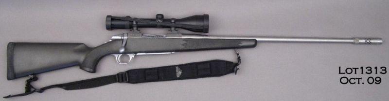 Browning A Bolt Model Stainless Steel bolt action rifle, .338 Win Mag cal., 27” round barrel including adjustable muzzle break, composite plastic stock, #7383INV8S7. This rifle is in overall fine condition showing a matted stainlesssteel finish, excellent bore, action, markings and stock. Mounted with a Zeiss Diavari V scope and Butler Creek padded sling. Est.: $500-$1,000.