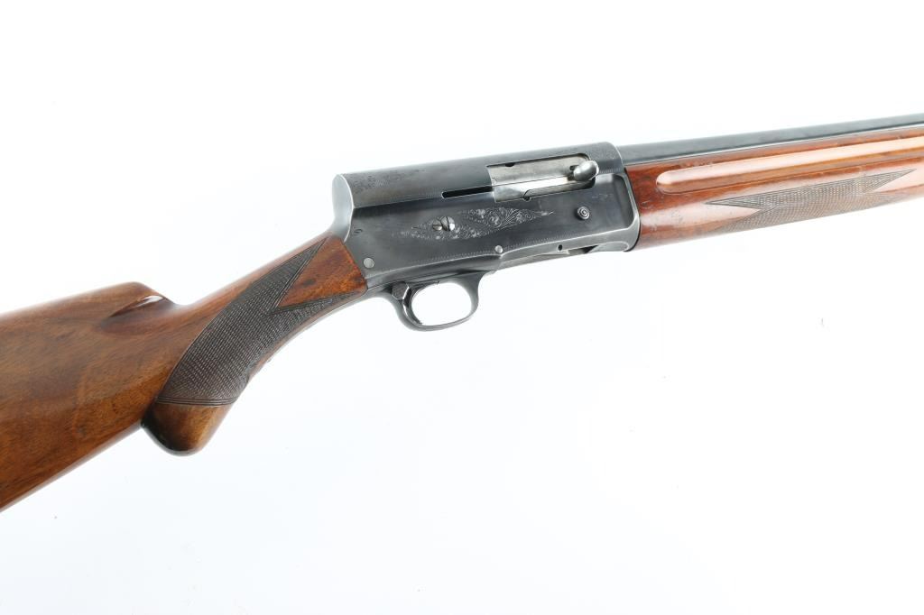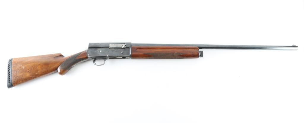 Belgium made semi-automatic shotgun chambered for 2 3/4" 12 gauge shells, circa 1952. ( First year of production by FN) Features a blued finish, 29.5" CYL choke barrel, bead front sight, 1/2 length tube magazine, push button safety, polished bolt with checkered charging handle, scroll engraved receiver, smooth trigger, checkered walnut forend and pistol grip shoulder stock with factory black vented recoil pad.. Shotgun exhibits approximately 70% of it's original blued finish with edge wear/scratches/rubs, handling loss to the underside of the receiver, and tangs. Action is crisp, bore appears excellent/bright and wood stocks are good with only minor blemishes. NRA Condition-Good. C&R Firearm.
