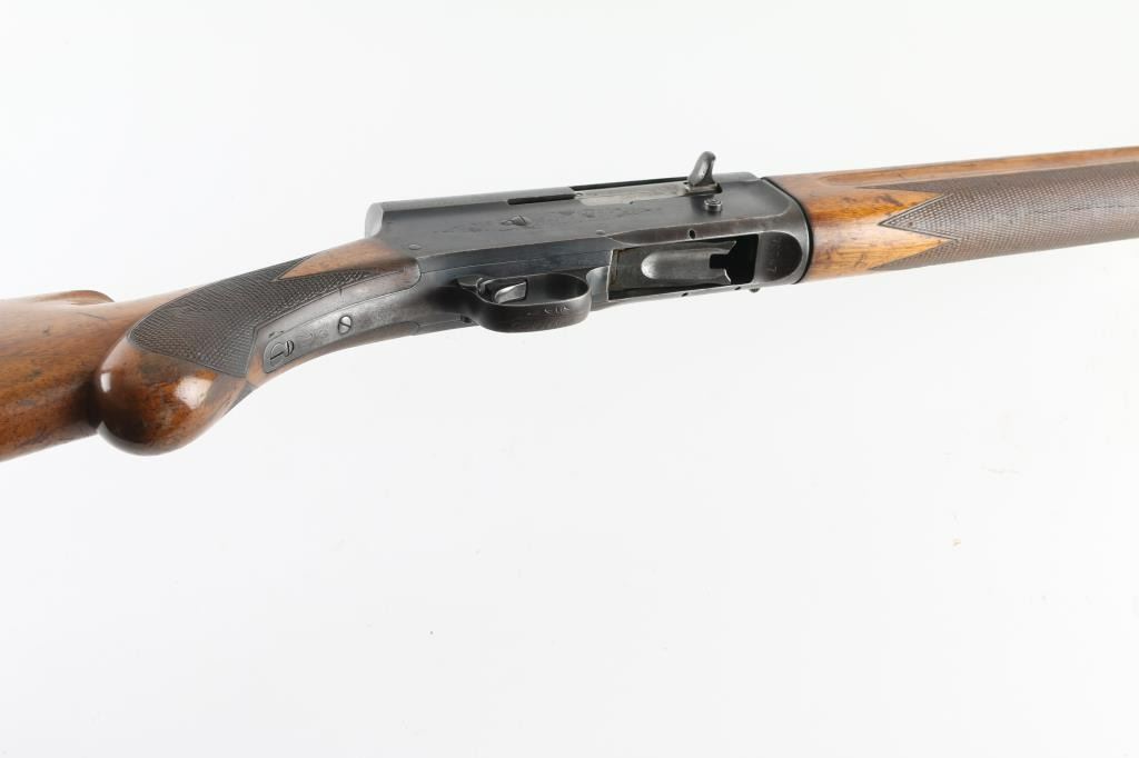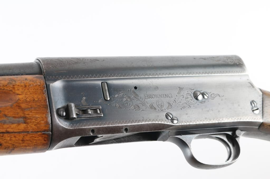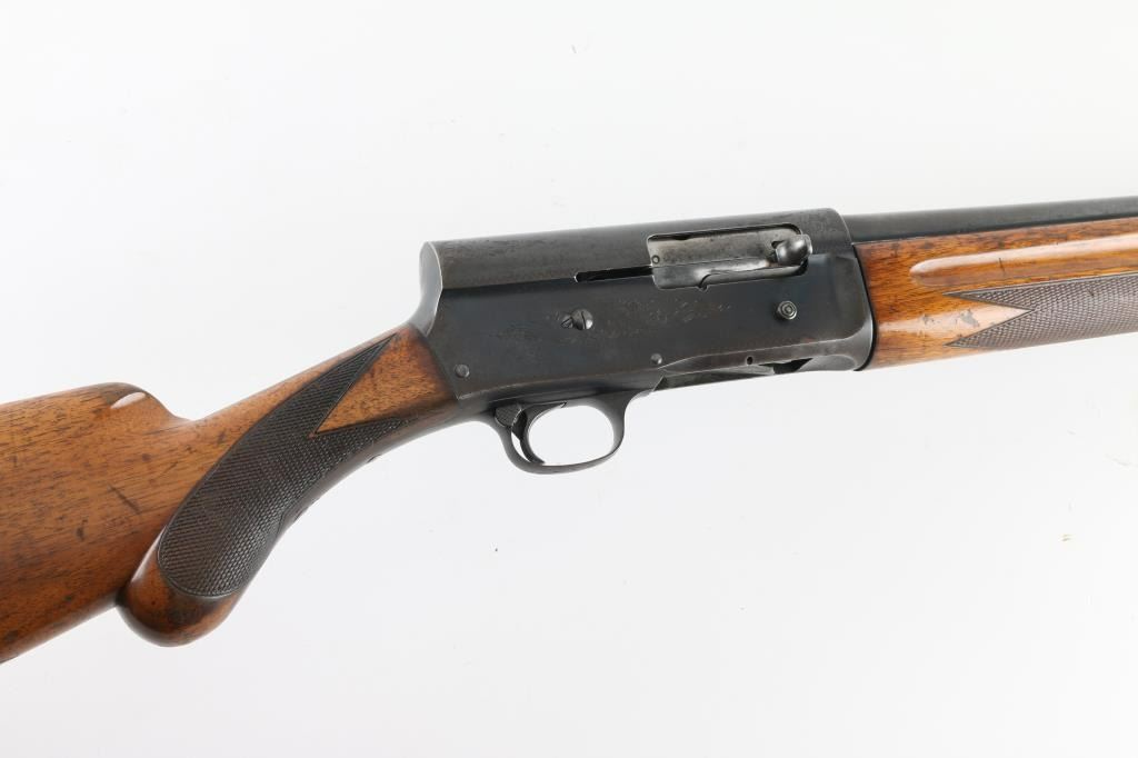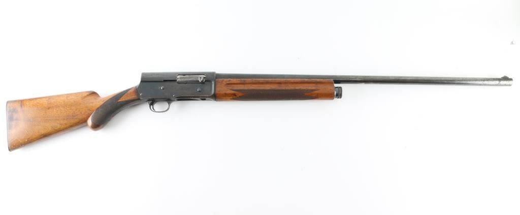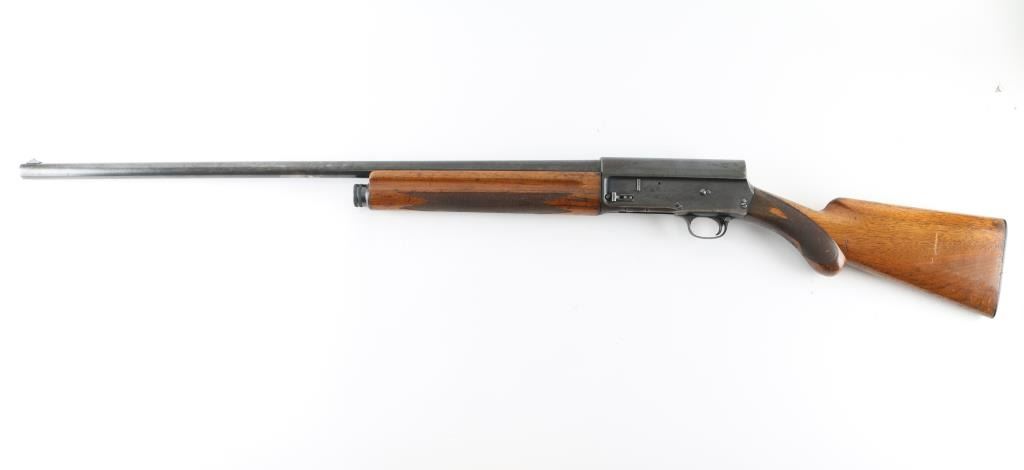 Made in Belgium this is the classic Auto 5 designed by John Moses Browning. It is a semi-auto shotgun chambered for 2.75" 12 gauge shells circa 1964. It has a 29.5" blued barrel and receiver with a raised bead front sight, magazine cut off, metal trigger guard, smooth trigger and manual safety behind the trigger. It has two piece wood stocks with checkering at the wrist and forearm and finger grooves above the checkering on the forearm. It has a black butt plate with Browning Automatic embossed around the outer portion and FN in the middle. Metal finish is mostly gone or fading along the barrel while the receiver is starting to patina. There is a crack in the forearm about 5" long starting from the receiver going toward the muzzle. It was probably caused by screwing the magazine cap too tight. Shoulder stock looks good but the gun was used. Bore looks good. LOP is 14.5". Choke measures Full. Condition is NRA Fair (needs replacement forearm) *C&R Firearm*