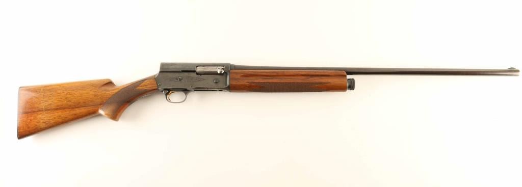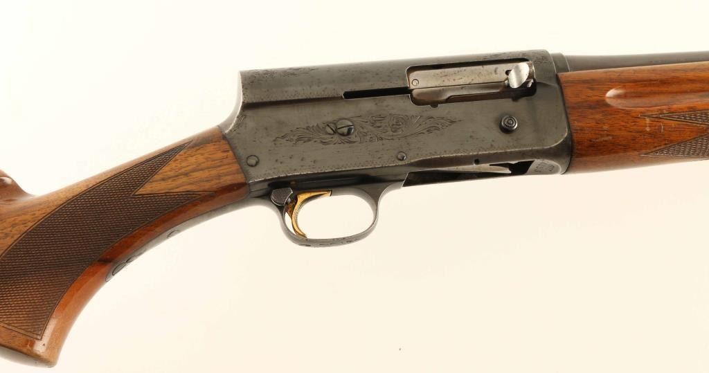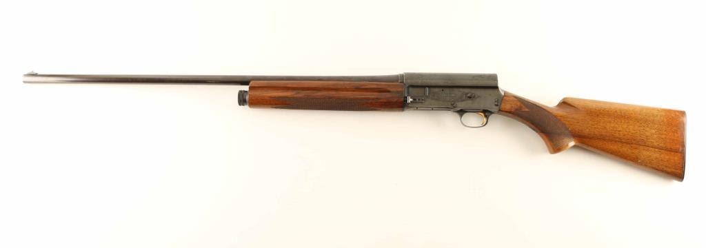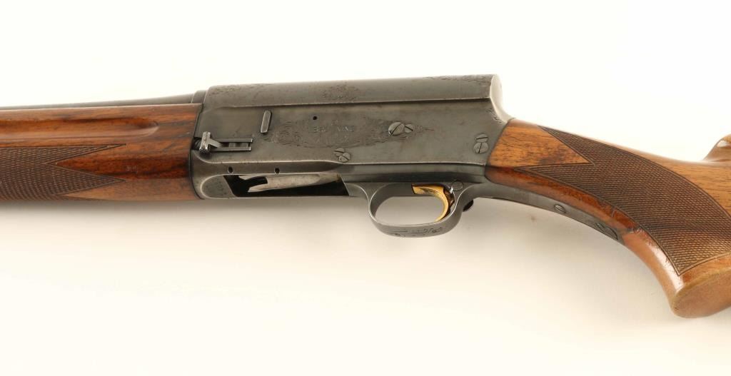 Shotgun, auto. 20 Ga. 27" barrel. Blued finish, with checkered wood stock, and grips. Belgium made. wood has minor scratches/dings. About 75 % blue, with loss around the loading/ejection port, and around the muzzle. Some spotting on the receiver/trigger. Bore appears very good/bright. Action is smooth/tight. NRA Condition-Good, plus. Modern Firearm.