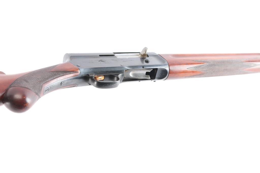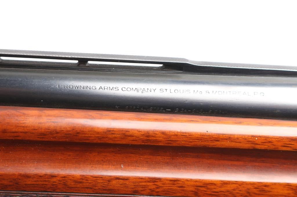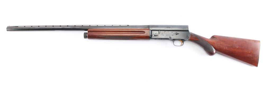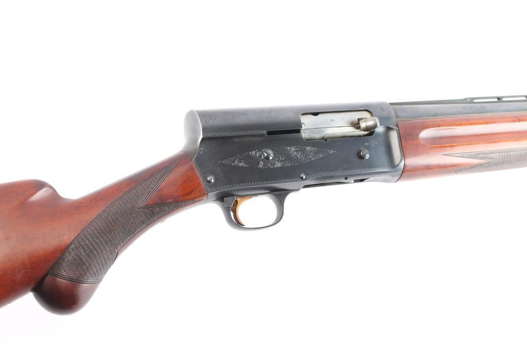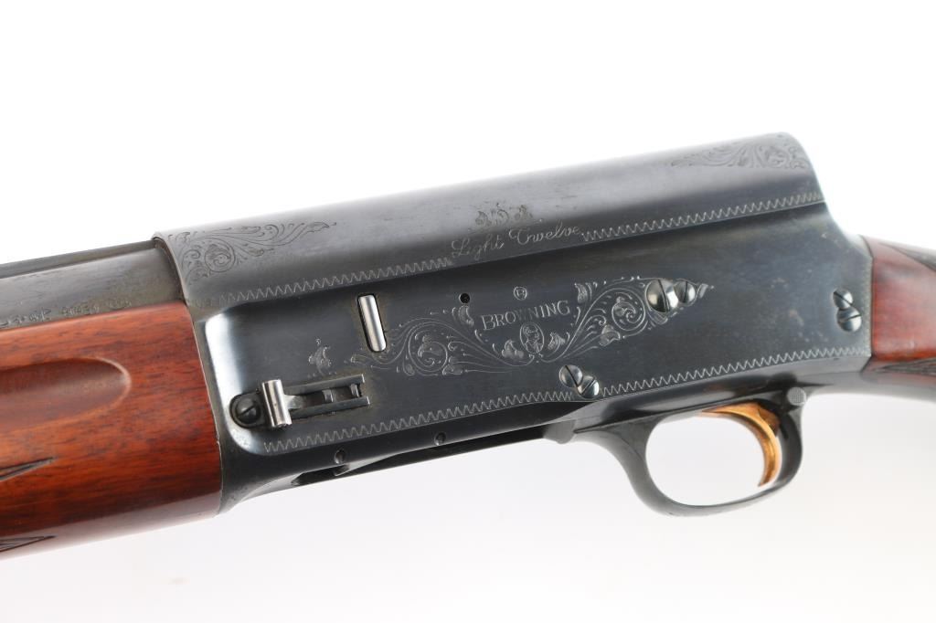Designed by John Moses Browning, a light weight version of the Auto-5. A semi-automatic shotgun chambered for 2 3/4" 12 Gauge shells. Belgium made A5 circa 1960 with the St. Louis barrel address on the left side of the barrel, Belgian proof marks on the left side, and 'Made in Belgium" on the right side. Shotgun features a blued finish, a 27-1/2" ventilation ribbed barrel, bore measures 'full' with a drop-in gauge, steel bead front sight, magazine cut-off, metal trigger guard, smooth slightly curved gold-toned trigger, and checkered cross-bolt manual safety behind the trigger. The hardwood furniture consists of a round knob pistol gripped shoulder stock with checkering at the wrist, elaborate 'Authentic Browning' embossed composite butt plate, 14-1/2" length-of-pull, 1-5/8" drop at comb, 2-1/2" drop at heel, and finger grooves above the checkering on the forearm provide a "Prince of Wales" style grip. Shotgun displays limited coverage of floral scrolls and edge designs on the receiver, trigger guard, and tangs. The original blued metal finish is about 95% with minor scratches, and edge wear. The metal has light scattered rust, and no observed metal deformation. Bore is bright and shiny, and the wood furniture is in very good condition with minor scratches and dings, impressions, and some finish loss spots mostly on the shoulder stock. The action is smooth and crisp.