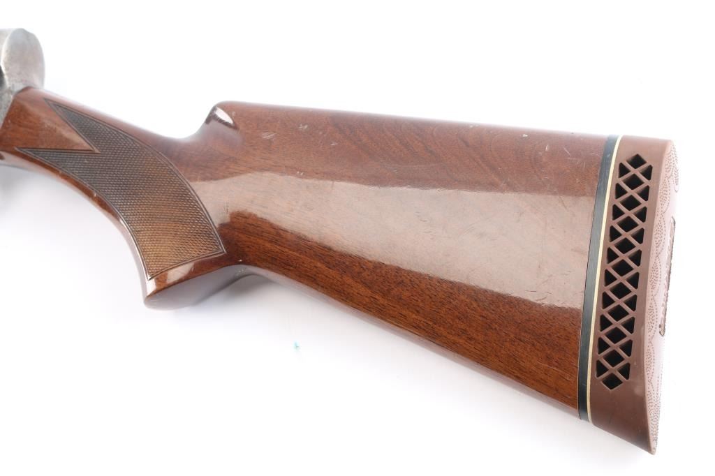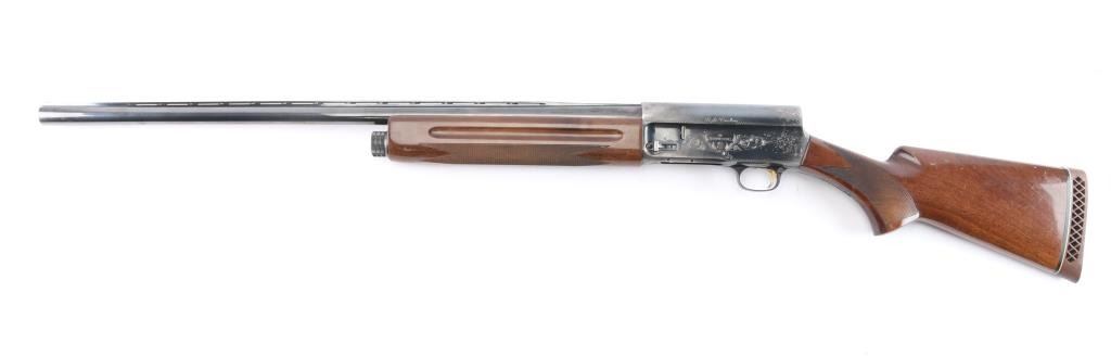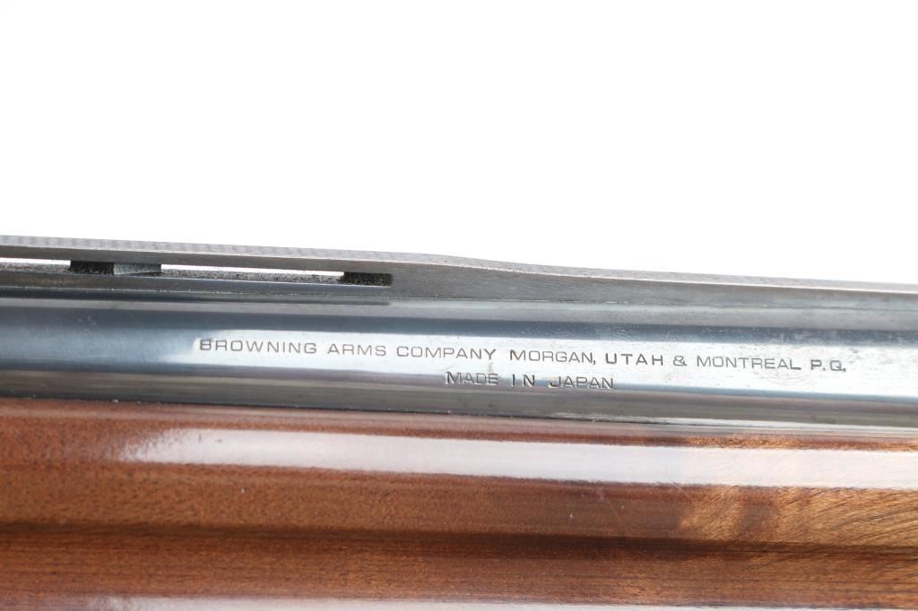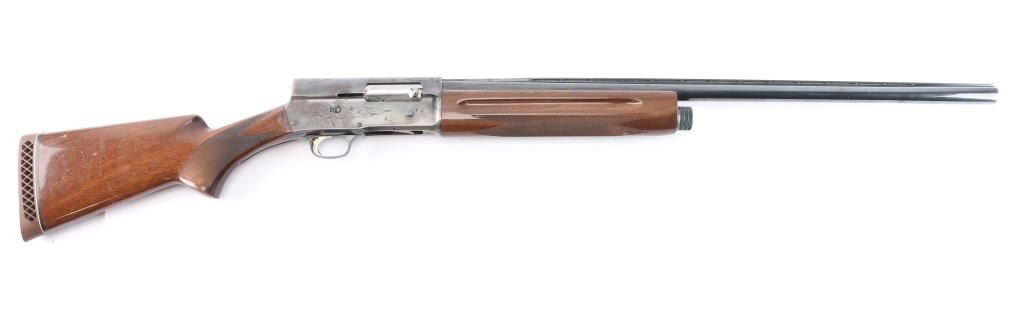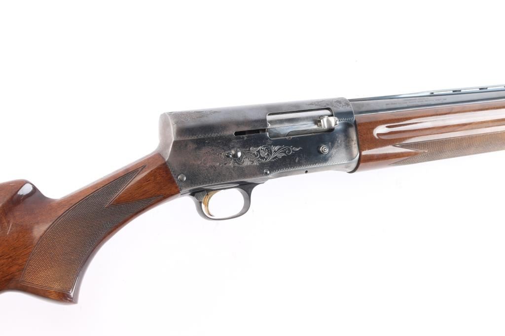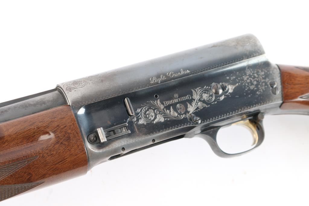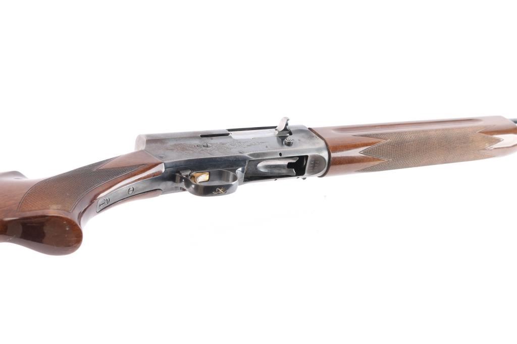 Made by Miroku in Japan, this is the classic Auto 5 designed by Browning in the Light Weight version. It is a semi-auto shotgun chambered for 2.3/4" 12 gauge shells circa 1985. It has a 28" vent rib, blued barrel, accepts screw-in chokes (IC Choke installed), magazine cut off, metal trigger guard, smooth gold tone trigger and manual safety behind the trigger. It has two piece wood stocks with checkering at the wrist and forearm and grasping grooves above the checkering on the forearm. It has a Browning vented brown rubber recoil pad. Limited engraved receiver & trigger guard. blued Blue finish is about 70% with handling wear, mostly on the receiver, lower barrel and tangs. Some scattered pin-prick pitting on the receiver. Wood stocks are very good with minor scratches/dings. Bore is excellent/bright. LOP is 14 1/2".