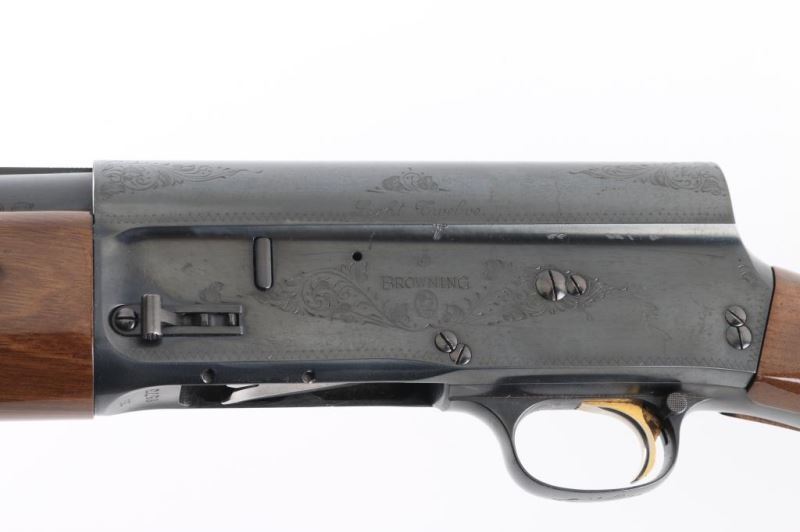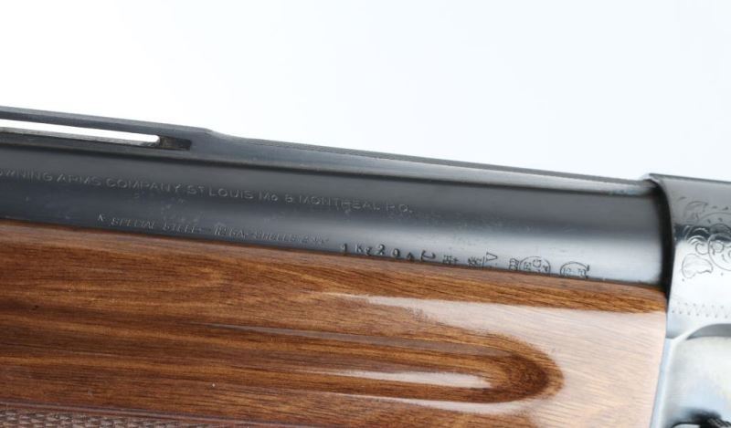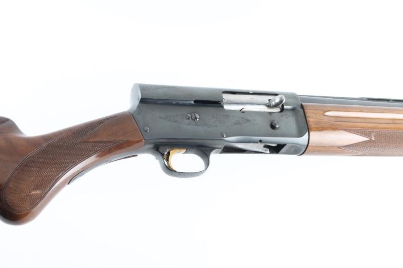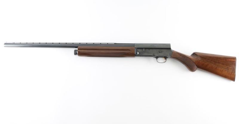 Belgian semiautomatic shotgun imported by Browning Arms Co, St Louis MO. Takes 2-3/4" shells. Features approx 26.5" vent rib barrel, choke measures FULL, front bead, blued finish, gold accent trigger, limited engraving on receiver says Light Twelve, Prince of Wales shaped pistol grip with checkering on grip and forearm, browning black plastic butt plate, manual safety. Bore looks good. This gun has been redone. Belgium blued receiver with what appears to be a Japanese urethane stock with a matte finish barrel. Condition: NRA Very Good as redone. C&R Firearm