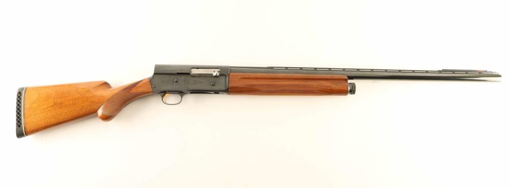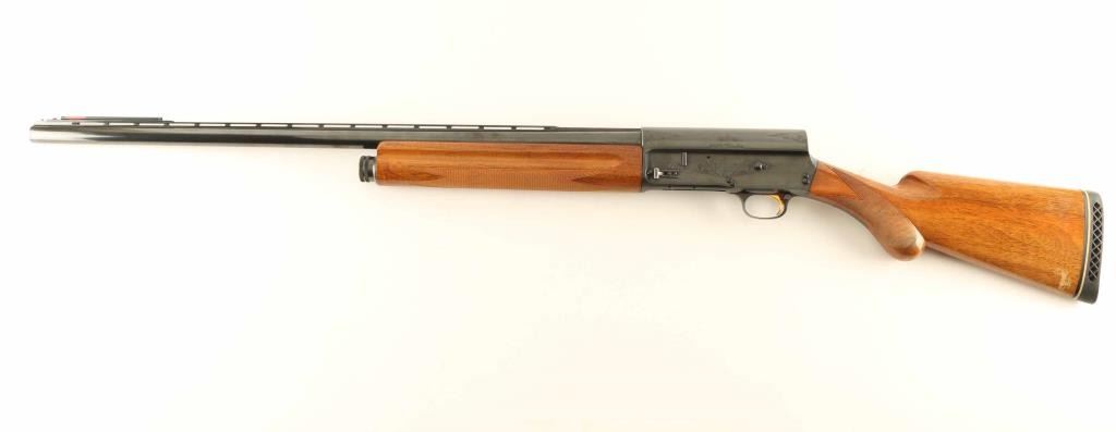 Belgium made light weight semi-automatic shotgun chambered for 2 3/4" 12 gauge shells, manufactured circa 1964. Features a blued finish, 27.5" modified choke barrel with ventilated sighting rib, silver bead front sight, installed aftermarket front sight with orange fiber optic rod, 1/2 length tube magazine with cut-off switch on the left side of the receiver, push button safety in the rear of the trigger guard, polished bolt with knurled charging handle, light coverage scroll engraved receiver, smooth gold trigger, checkered walnut forend and pistol grip shoulder stock with round knob, John Barkley recoil pad & 14.25" LOP. Shotgun exhibits approximately 98% of it's original blued finish showing little wear and a small amount of light scattered surface rust on the back of the receiver. Action is crisp, the bore is excellent and the wood stocks are very good with some crapes & dings. Condition is near NRA Excellent. ***C&R Firearm***