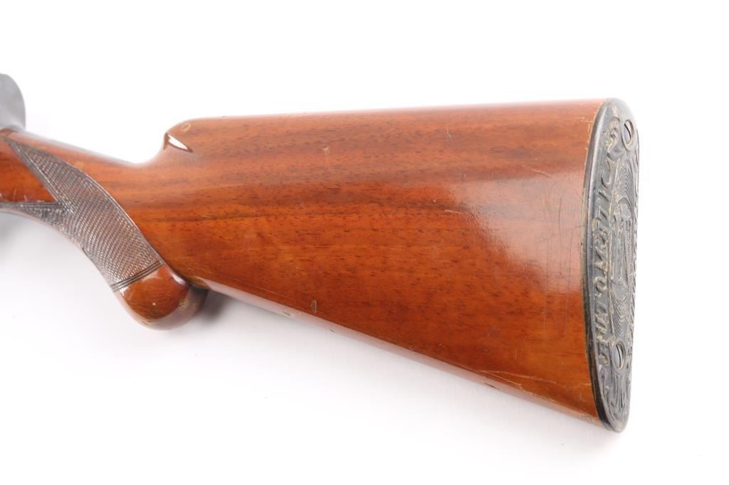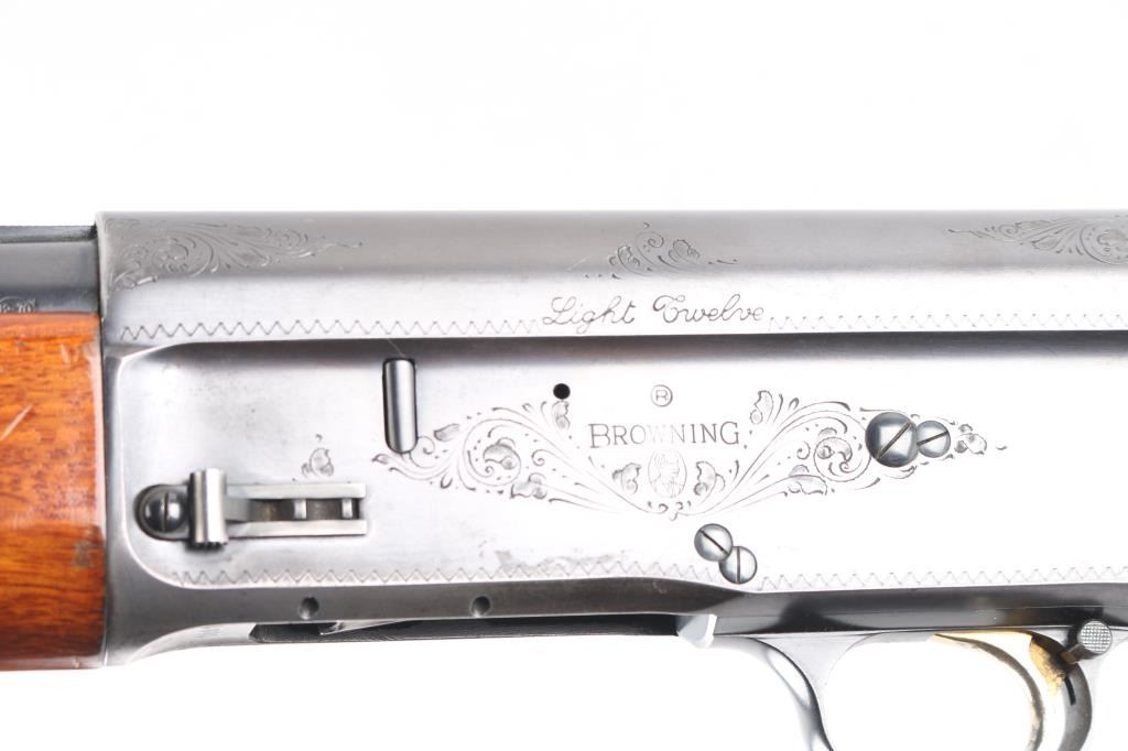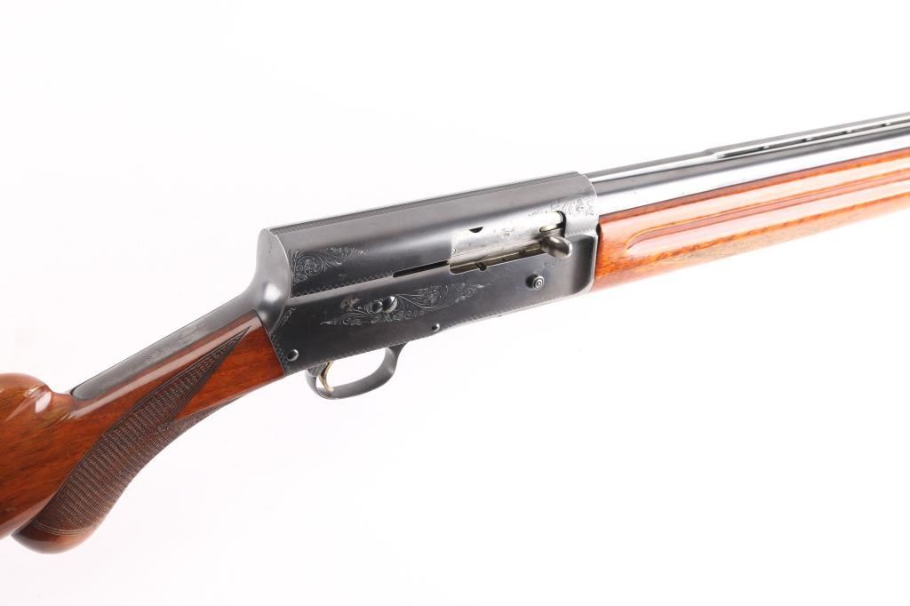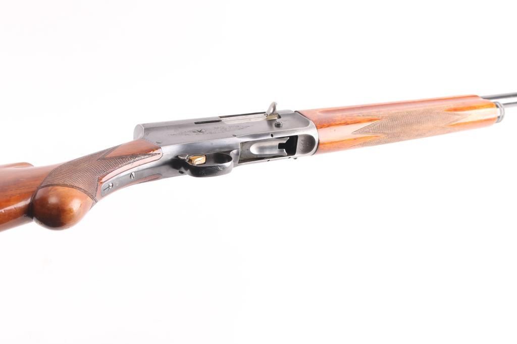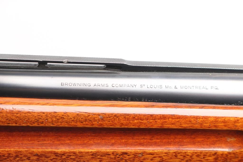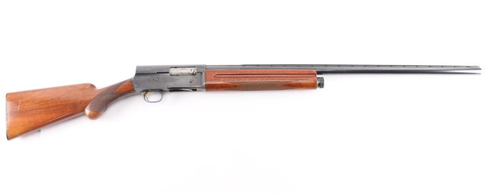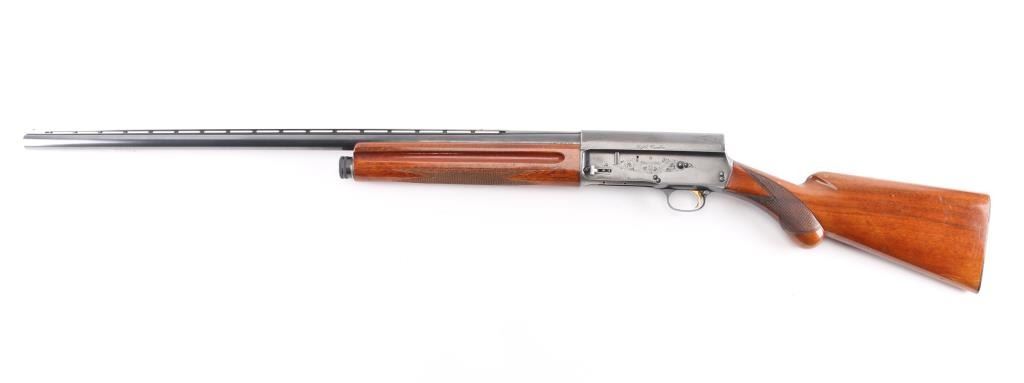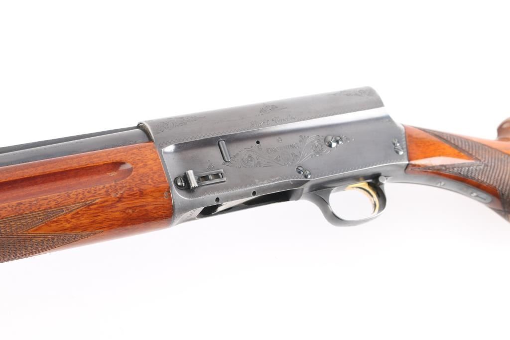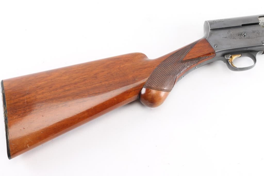 Made in Belgium this is the classic Auto 5 designed by Browning in the Light Weight version. It is a semi-auto shotgun chambered for 2.75" 12 gauge shells circa 1956. It has a 29.5" vent rib, blued barrel (Cyl Choke), magazine cut off, metal trigger guard, smooth gold tone trigger and manual safety behind the trigger. It has two piece wood stocks with checkering at the wrist and forearm and finger grooves above the checkering on the forearm. It has a black butt plate with Browning Automatic embossed around the outer portion and FN in the middle. Engraved receiver & trigger guard. blued Blue finish is about 80% with handling wear, mostly on the underside of receiver, and upper tang. Some very minor spots of pitting on the bolt. Wood stocks are very good with minor scratches/dings. Bore is excellent/bright. LOP is 14 1/2".