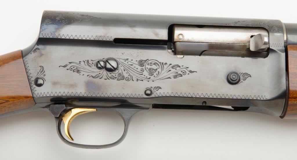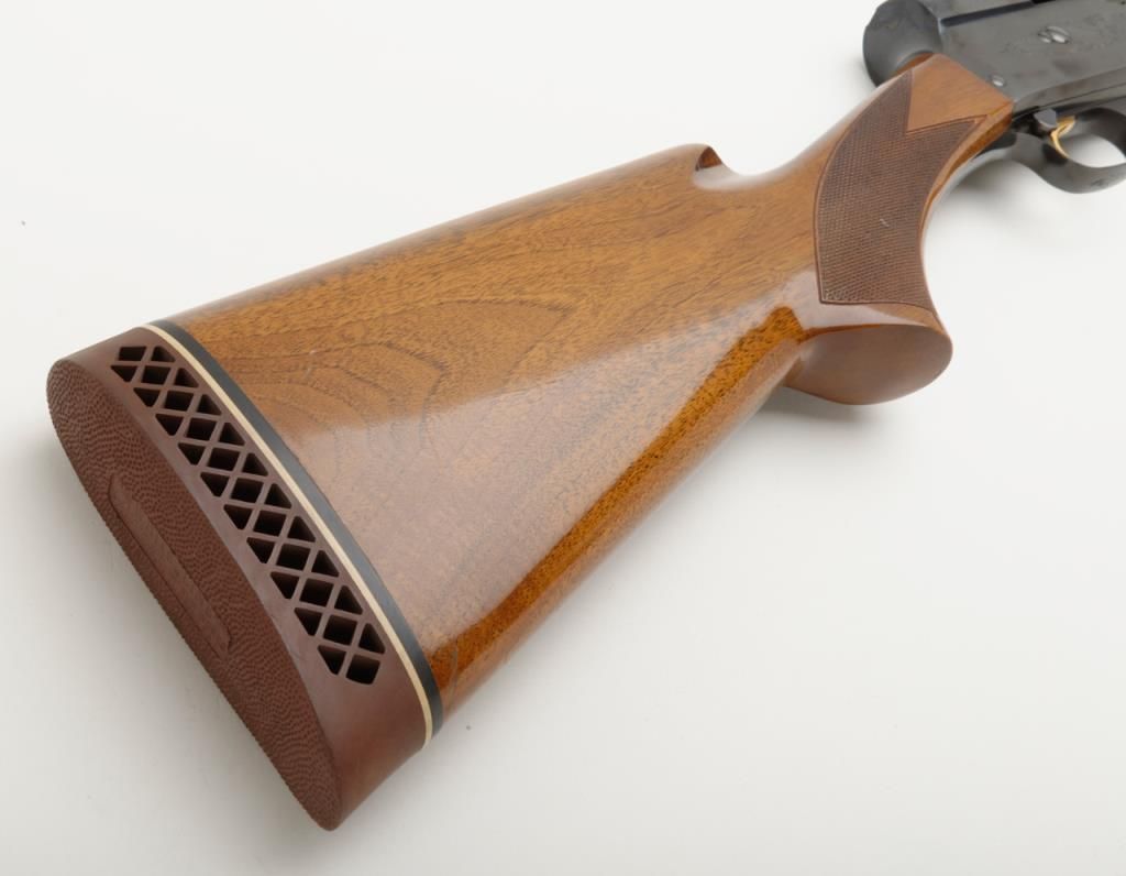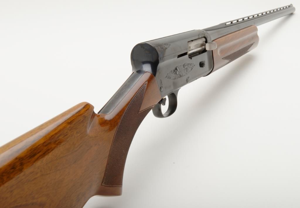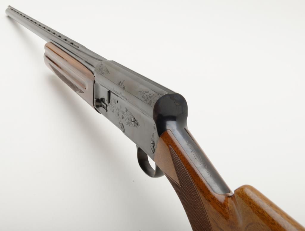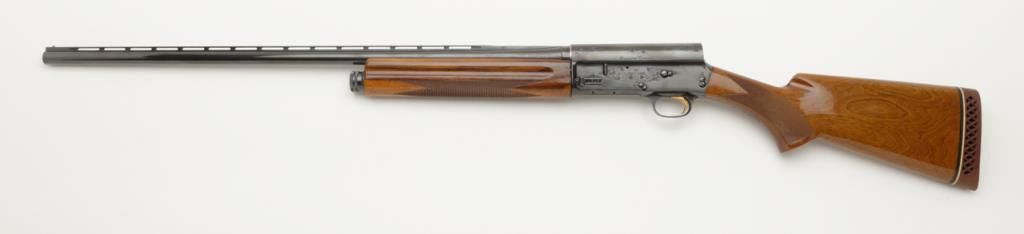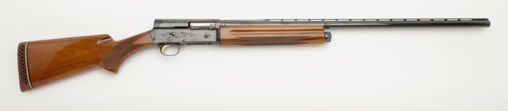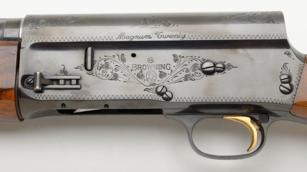 Browning Auto 5 Magnum 20, Belgian made semi-automatic shotgun in 20 gauge with 28” ventilated ribbed barrel chambered for 3” shells. Serial number 69X30393. The condition is fine to near excellent used condition 96% to 99% original blue. The stocks are also near fine with just some minor handling and slight storage marks. A hard rubber recoil pad has been added. Choked full. An exceptional and desirable Auto 5. Est.: $500-$1,000