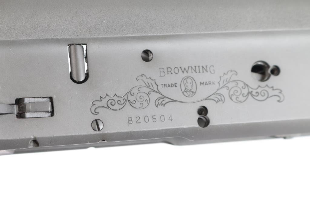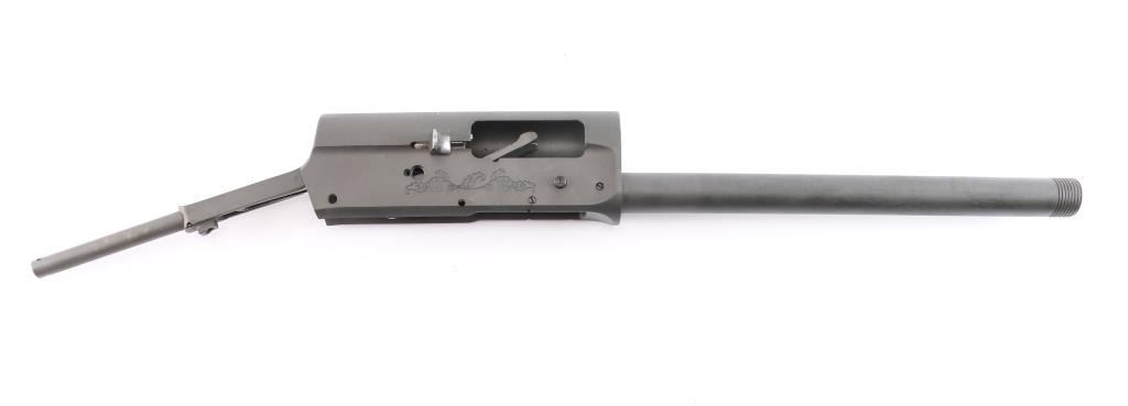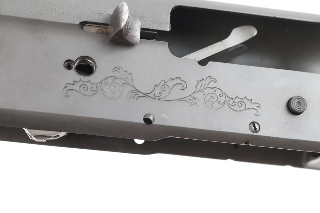 Designed by John Moses Browning, the classic Auto-5 is a standard weight semi-auto shotgun chambered for 2 3/4" 12 Gauge shells. Remington made the A5 between 1940 and 1947. The receiver features a parkerized finish, a magazine cut off, bolt, annular cut bolt release, checkered charging handle, and other internal parts. Shotgun displays a limited coverage of floral scroll engravings on the receiver with the Browning insignia on the left side. The parkerized metal refinish is about 99% with nothing remarkable. Metal displays some rust inside the magazine tube.