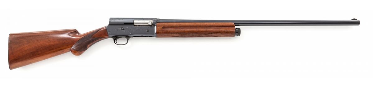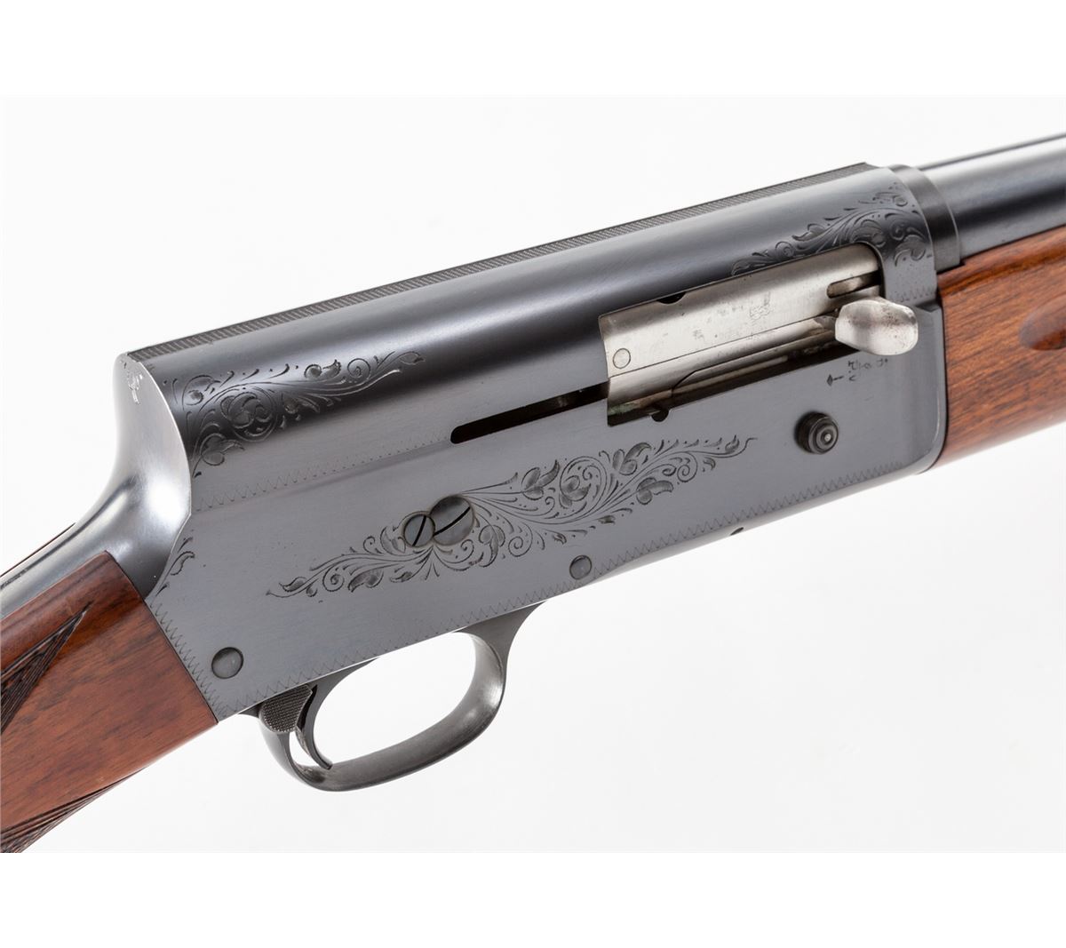 Browning Auto-5 Semi-Automatic Shotgun, #R51636, 16 ga., 28'' round barrel choked Full, standard engraved blue finish, round knob long tang checkered walnut stock, and factory horn buttplate. Condition is near excellent showing just light field use as represented by minor dings and scuffs to stock, and light edgewear to metal surfaces. Good action, bright bore. Est.: $500-$750. (C&R)