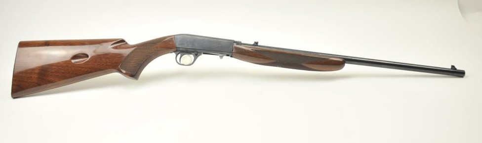 Browning Automatic Takedown Rifle, #01724PP146, .22 LR, 19 ½” barrel, blued finish, with walnut stock, flip down adjustable rear sight and tubular magazine. Rifle remains in very good to fine conditionoverall, retaining 96-98% original blue, fine bore, and great action. The walnut stock is very good plus with minor nicks, dings and dents from storage and use. Includes original owner’s manual. (Modern/PPT) Est.$350-700
