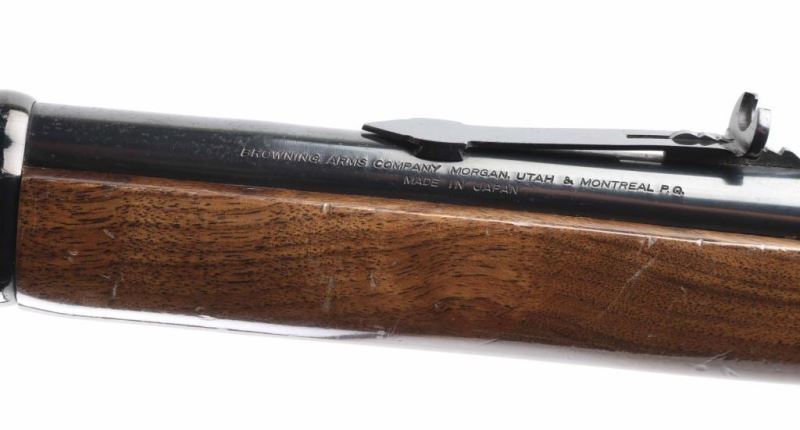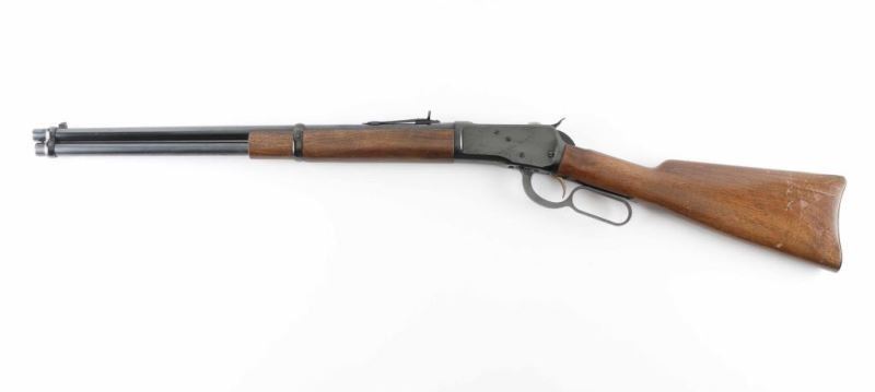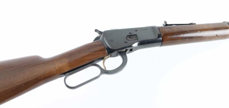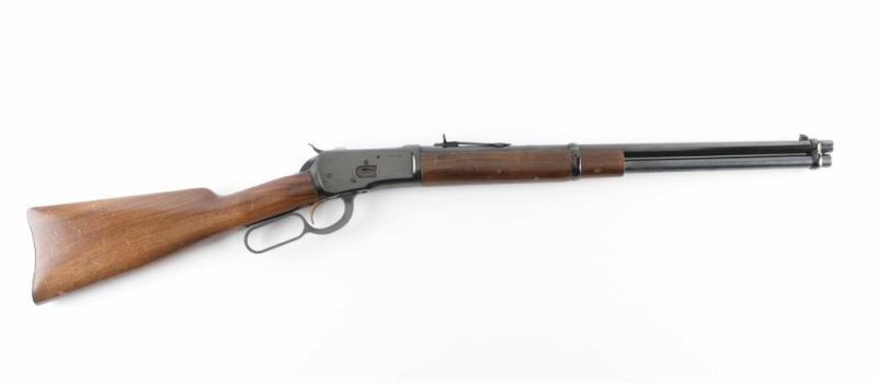 Rifle. Lever-Action. Carbine configuration. 20" round barrel with blade front, and adjustable u-notch rear sights. Gold tone trigger. Straight walnut stock/forearm. Crescent steel buttplate . Action is crisp/tight. Bore appears excellent/bright. Blued metal finish is about 85%, with edge wear/ scratches. Wood has numerous scratches/dings. Nothing serious. NRA Condition-Good. Modern Firearm.