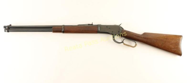 Japanese made lever action repeating rifle chambered in .44 Magnum. circa 1981. Features a blued finish, 20" barrel, full-length tube magazine, raised blade front sight, adjustable semi-buckhorn rear sight, smooth gold trigger, checkered hammer spur, two barrel bands, partially suede wrapped lever, smooth walnut forend and straight grip shoulder stock with metal carbine buttplate. Rifle exhibits approximately 80% of it's original finish showing some edge wear, scatter handling marks/scratches and spots of heavy wear on the top of the barrel, right side of the receiver and on the upper tang. Action is smooth, bore is very good and wood stocks are good with numerous small dings/scrapes. Condition is good. ***Modern Firearm***