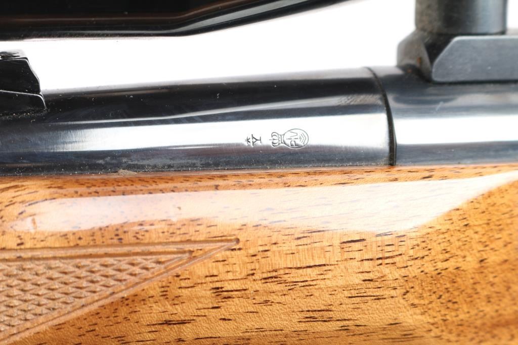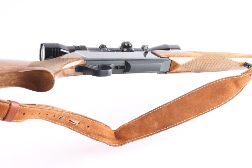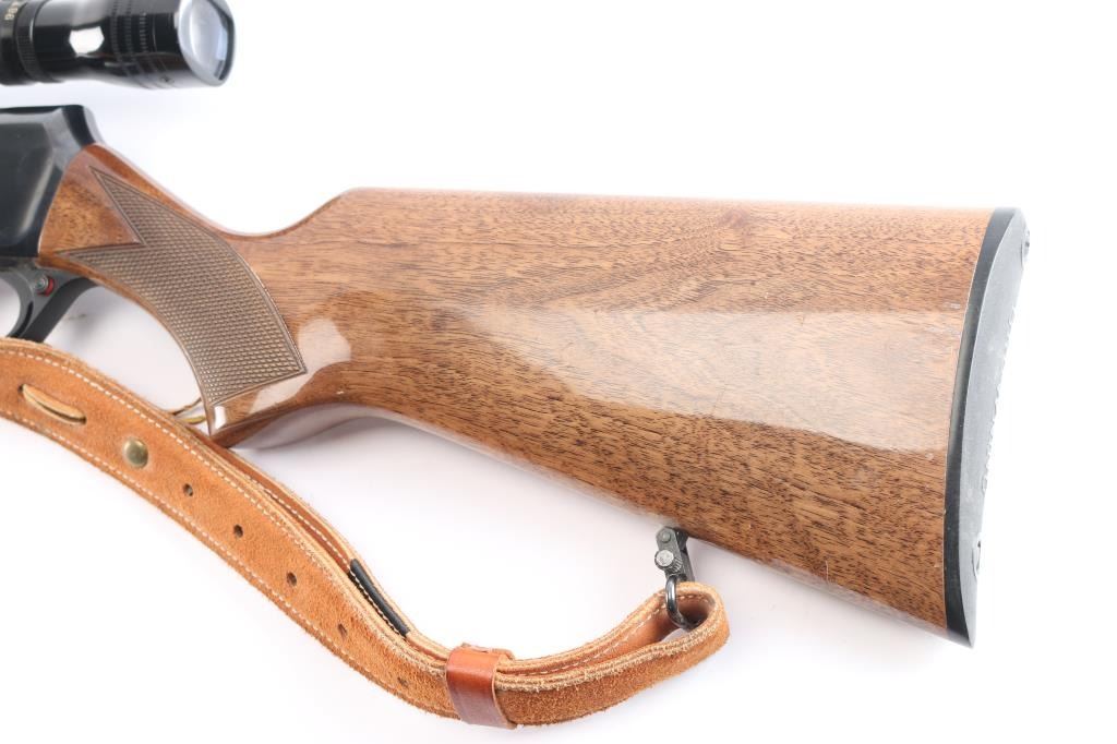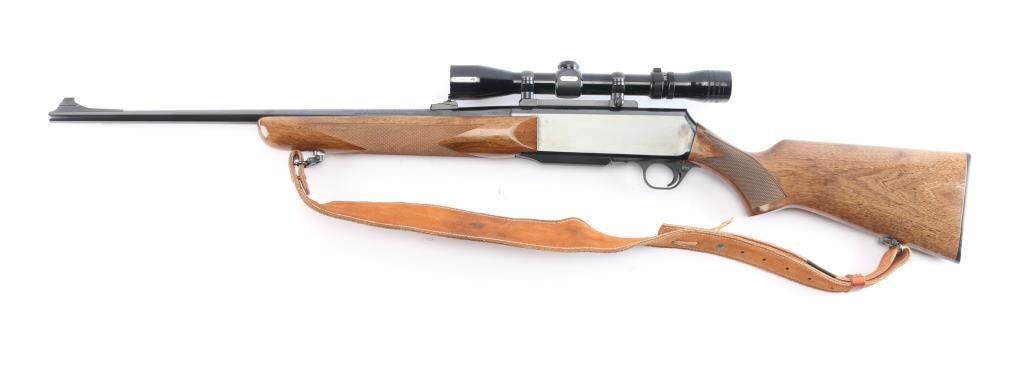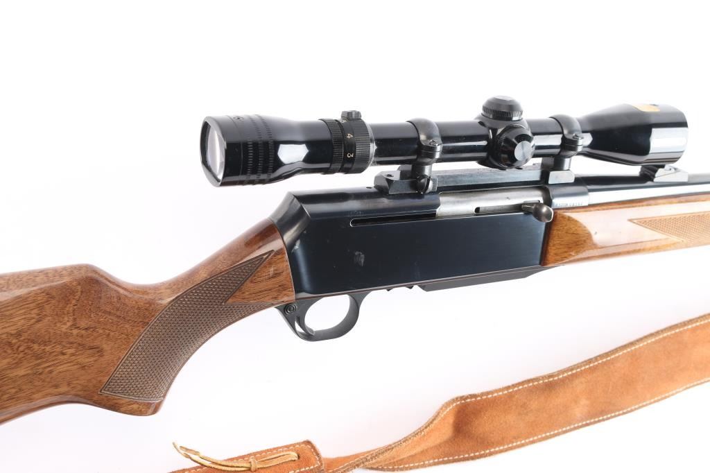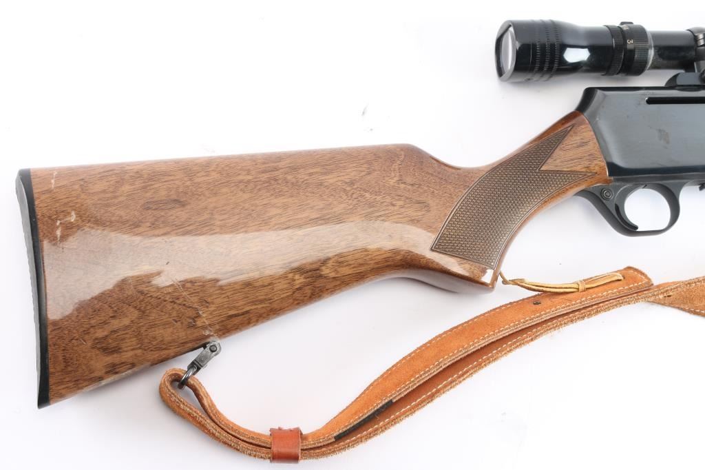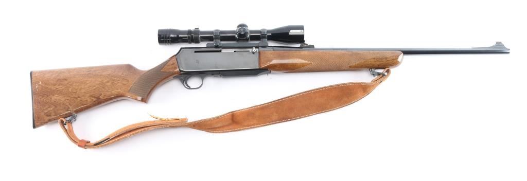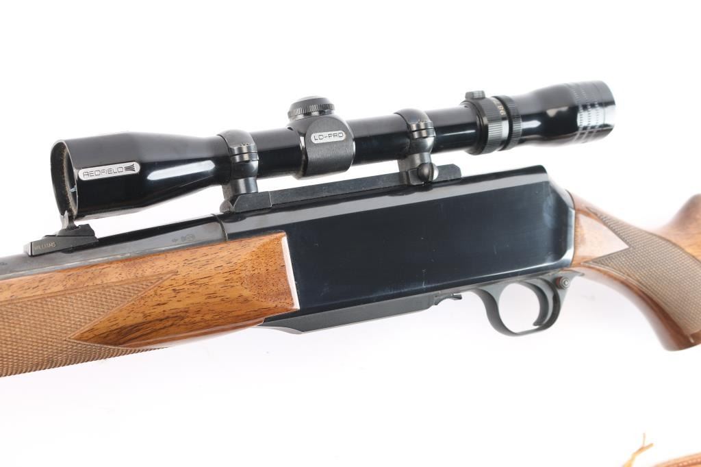 Belgium made 'Grade I,' a gas operated semi-automatic sporting rifle chambered for .270 Winchester, manufactured circa 1979 by Fabrique Nationale. Rifle features a high polish blued finish, 22" tapered round barrel, seven lug rotary bolt, checkered ramped blade front sight with brass bead, fully adjustable 'U' notched rear sight, receiver drilled and tapped for optic mounting, smooth curved trigger, aluminum trigger guard, annular cut cross-bolt manual safety, no bolt release, hinged floorplate with detachable three-round magazine, and serrated sliding magazine release. The high-gloss walnut furniture consists of a semi-pistol gripped shoulder stock with checkering at the wrist, swivel studs on the shoulder stock and forend, checkered walnut forend, and black factory hard rubber butt plate. This BAR has a Redfield LO-PRO 3-9x rifle scope with a duplex reticle, and it is mounted using a Redfield single-piece mount. Rifle retains approximately 98% of its original blued finish showing superficial scratches, and a couple of blemishes on the right side of the receiver. Metal displays no rust, or deformation. The action is smooth and crisp, and the bore is bright with strong rifling. The walnut furniture is good to very good with scratches and dents mostly on the shoulder stock. The scope's sight picture is bright and clear with the slightest of yellowing. Rifle includes a brown leather sling.