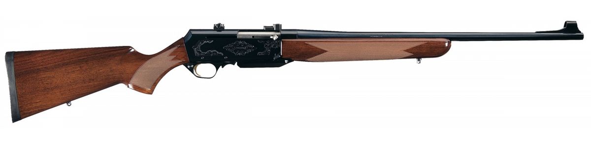 Introduced in 1993 with this caliber introduced in 1997, manufactured in Belgium and assembled in Portugal. Standard markings with hooded ramp front sight and rear sight removed with scope bases mounted on receiver. Receiver is light scroll engraved surrounding the word "Safari". Mounted with a checkered high gloss walnut forearm and pistol grip stock with a solid Browning recoil pad and sling swivel studs.