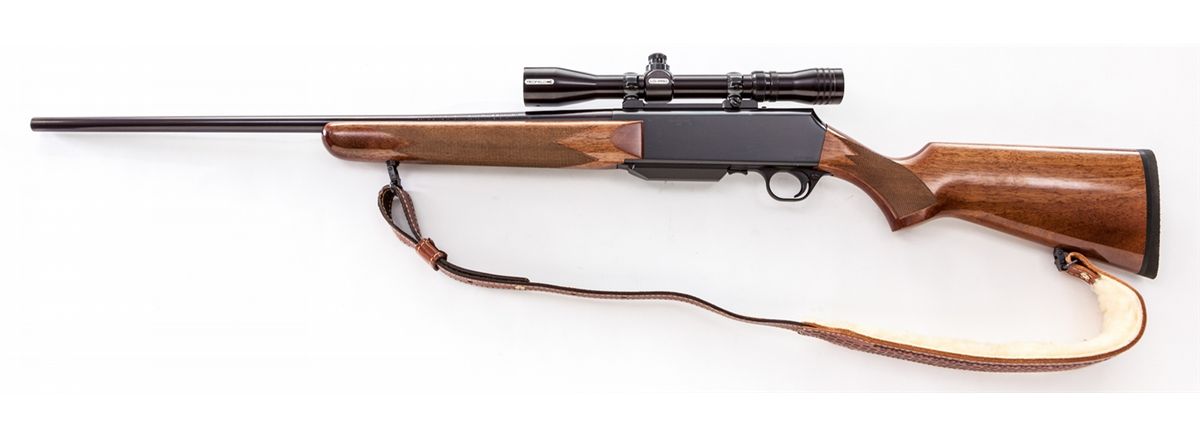 Browning BAR Semi-Automatic Hunting Rifle, #137PP26410, .338 Win. mag. cal., 24'' barrel, blue finish, checkered pistol-grip walnut stock, with sling and extra mag. Topped with a Redfield Lo-Pro 3-9 scope on Redfield rings and mounts. Made in Belgium, assembled in Portugal. Condition is excellent with minor handling marks. Appears new and unfired, with clear scope optics. Est.: $1,000-$1,500. (Modern)