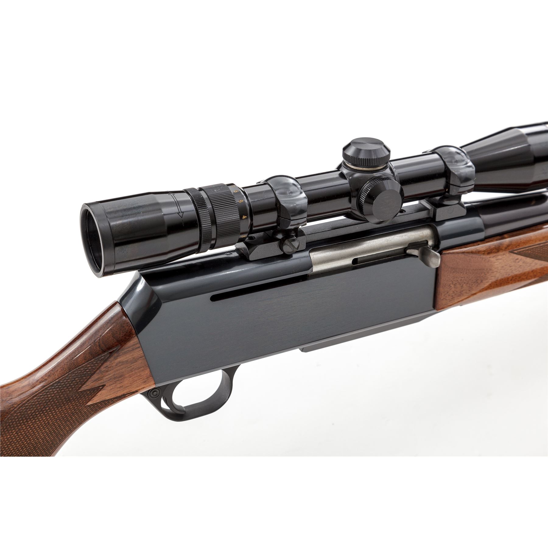 Browning BAR Semi-Automatic Rifle, #137PN07910, .30-06 cal., 22.5'' barrel, blue finish, checkered mahogany stock, with Williams rear and bright bead front sight, and brown padded and tooled leather sling. Topped with Nikon 2-7x32 scope on Redfield rings and mounts. Made in Belgium, assembled in Portugal. Condition is excellent, appearing nearly new. Left side forward portion of barrel with very light markings running approx. 8'' from muzzle back. Stock with several pressure dings in pistol-grip area, one which is thru the finish. Good action, mirror bright bore, clear optics. Est.: $600-$800. (Modern)