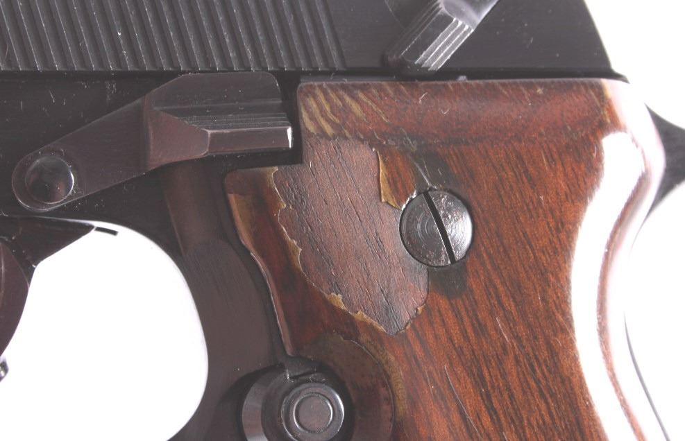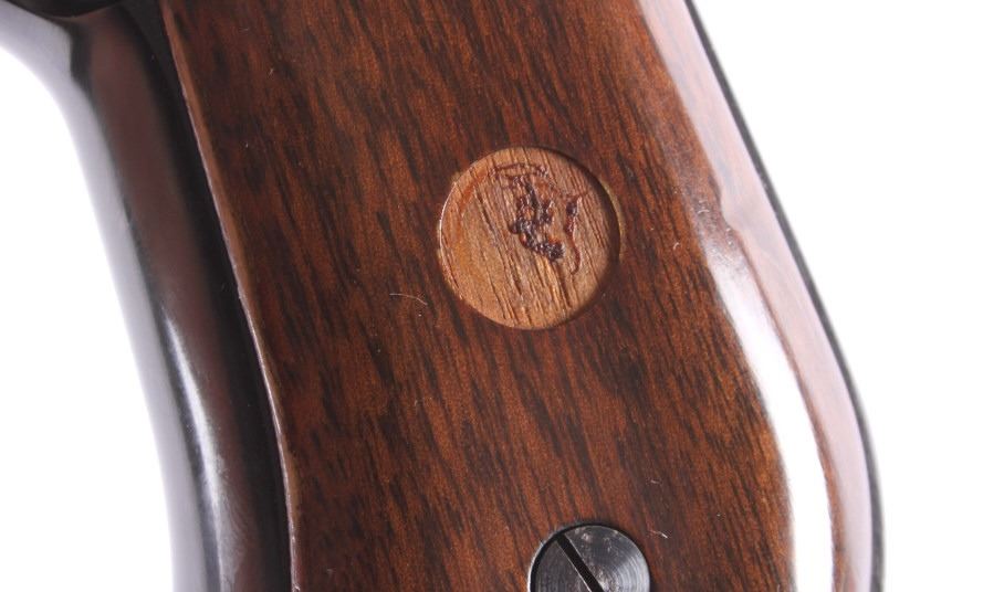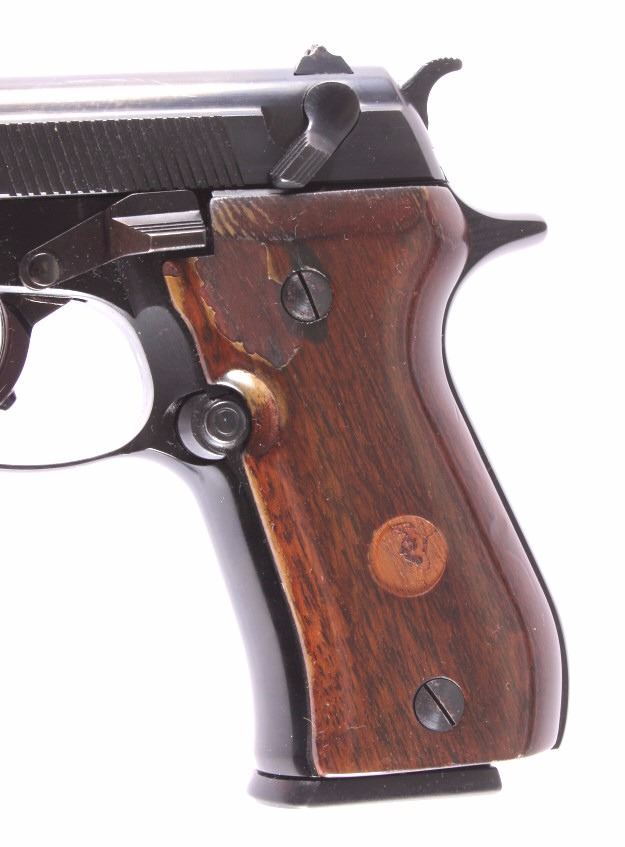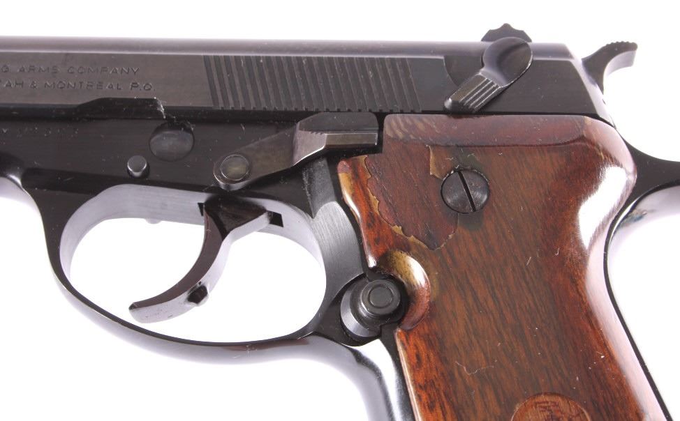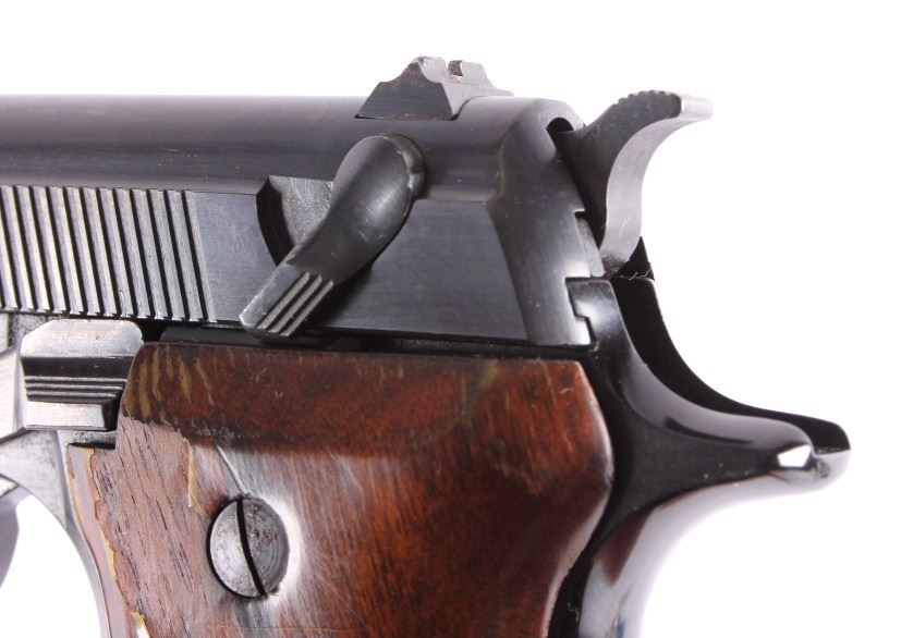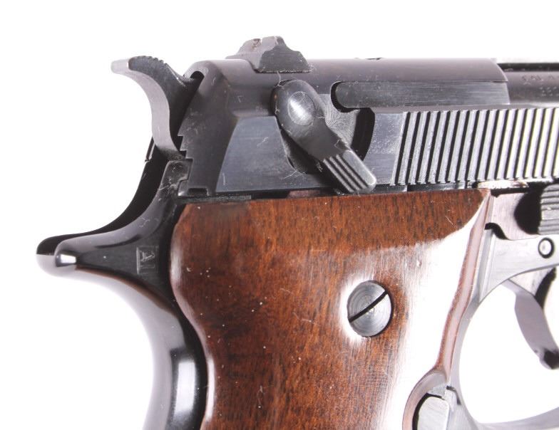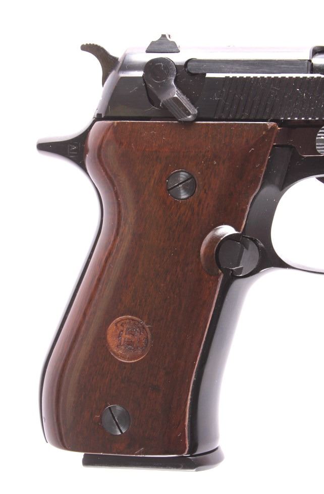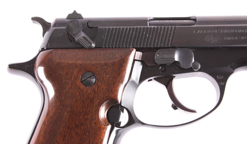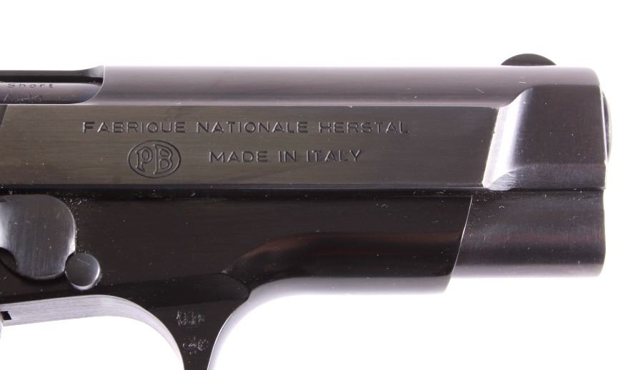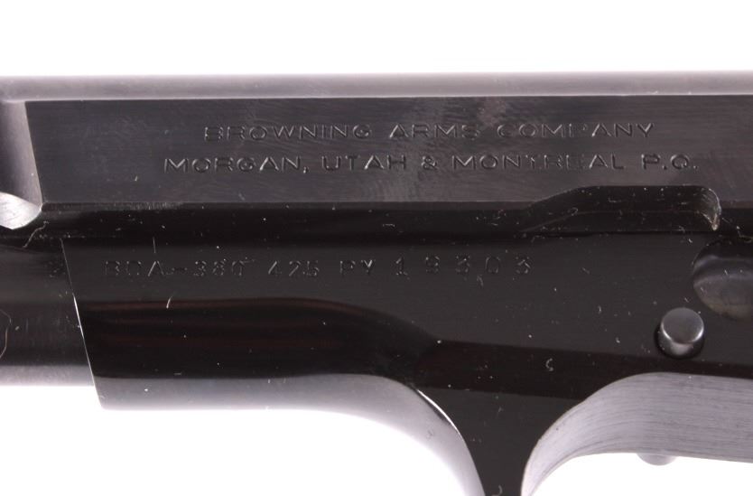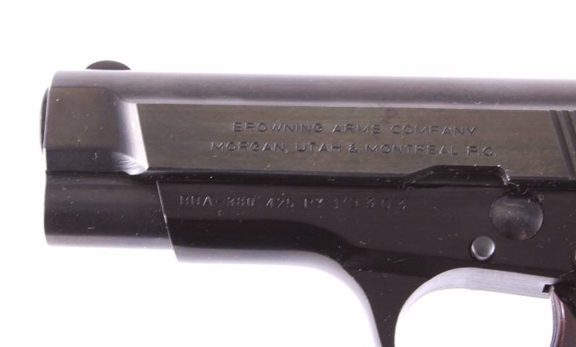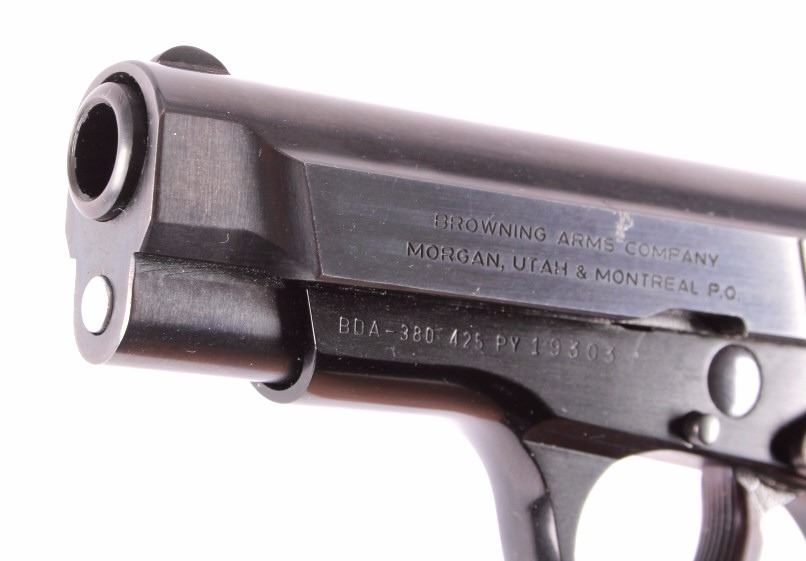 This is a Browning Model BDA-380 semi-automatic pistol chambered in the .380 auto caliber. The pistol features a blue'd steel frame and slide with solid walnut hardwood stocks. The slide is marked on the left side "Browning Arms Company / Morgan Utah & Montreal P.Q." and the right side of the slide is marked "Fabrique National Herstal Made in Italy". The Browning pistol is in good condition with 95%+ original blued finish. The pistol measures 4.5" x 6.75". Serial number is PY19303. This is a modern manufactured pistol and requires a NICS Background Check or FFL Transfer.