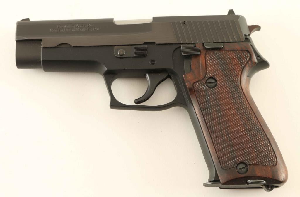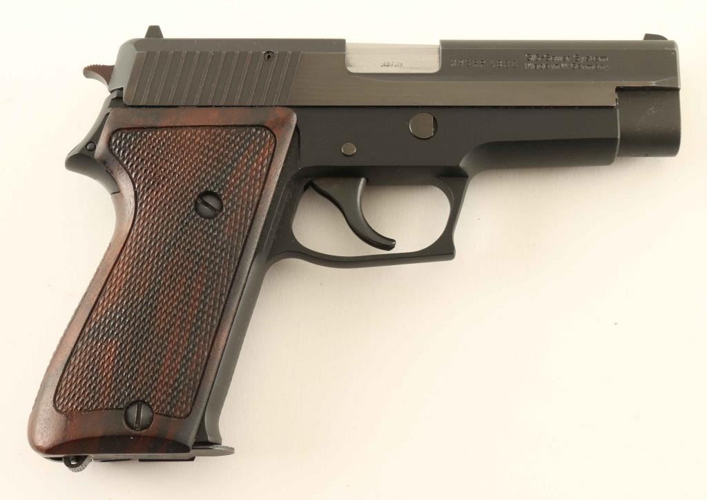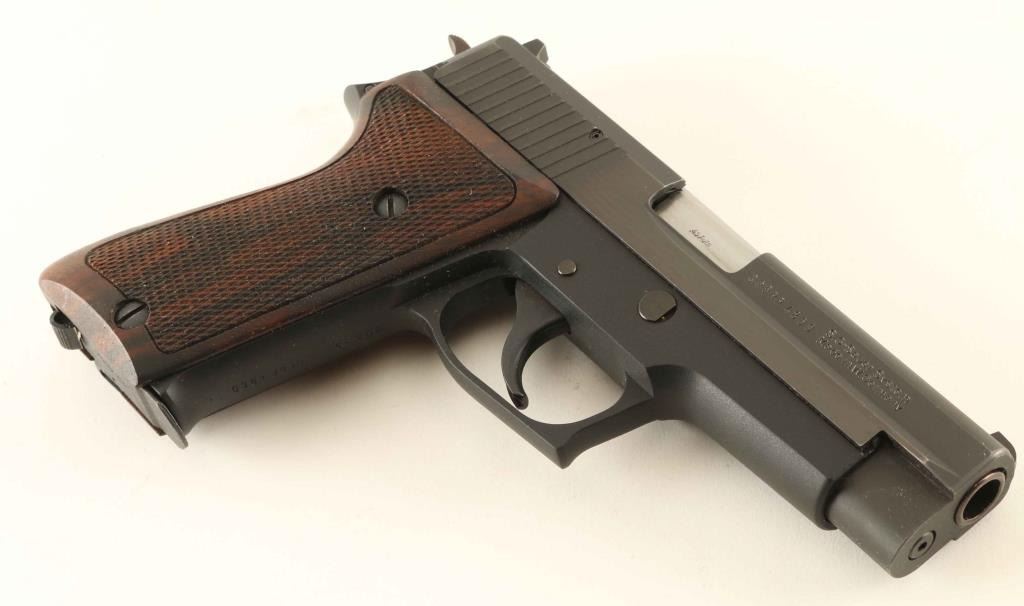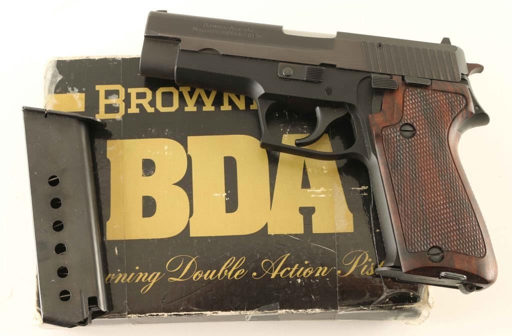 High quality double action semi-automatic pistol based off the Sig P220, manufactured in West German by Sig Sauer circa 1978. Features a matte black finish slide with polished flats, 4.4" barrel, white dot front sight, dovetailed rear sight with square notch & white bar, serrated trigger, serrated hammer spur, thumb decocking lever, heel style magazine release, 7 round 'dovetail' magazine, black hard coat anodized alloy frame and two-piece checkered figured wood wrap-around grips. Includes the original Browning box with documents and spare magazine. Pistol exhibits approximately 99%+ of it's original finish showing little to no wear. Action is crisp, bore is pristine and the wood grips are fine with dulled points. Condition is near NRA Perfect in box. ***Modern Firearm***