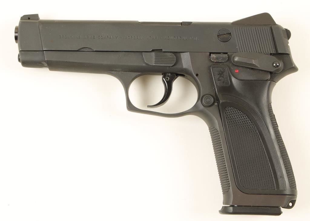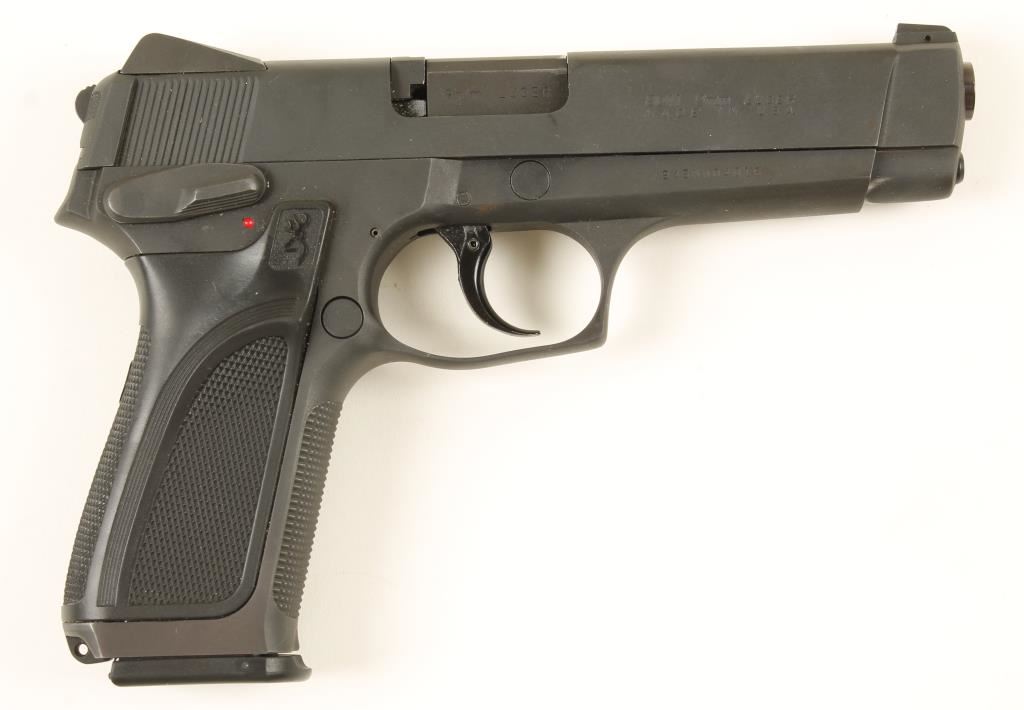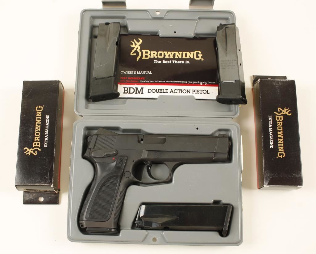 Double action semi automatic 9mm pistol by Browning. Features a 4.5" barrel, matte finished blued steel slide, three dot adjustable sights, blued alloy frame, ambidextrous safety & checkered black plastic wrap around grips. Includes grey plastic Browning case, four 10 round magazines, two 15 round magazines & instructions. Condition is excellent. ***Modern Firearm***