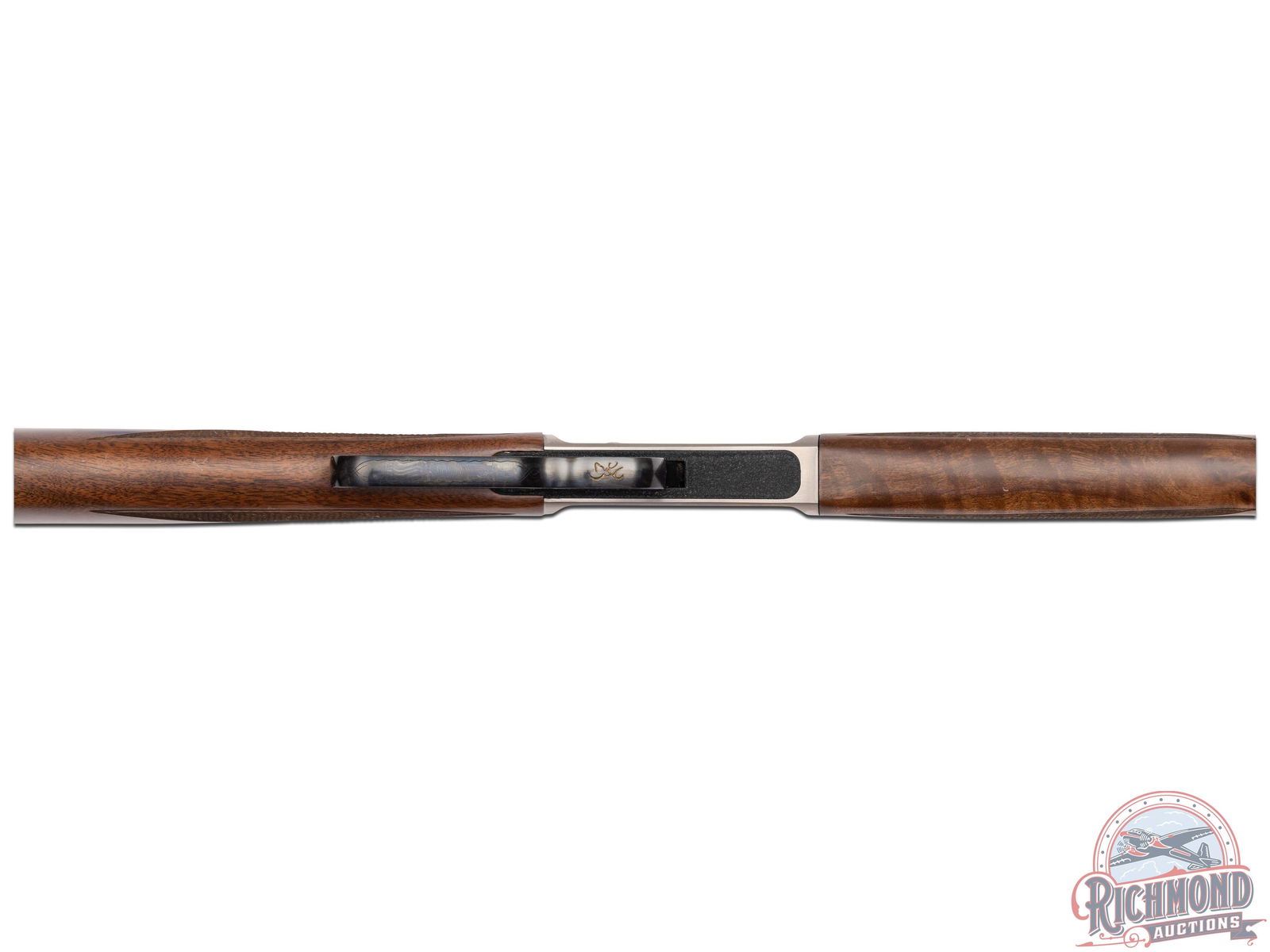 Manufactured in 2005. Features a 20"round blued barrel with full length magazine tube. flip-up rear adjustable notch sight and blade front sight. Coin finished receiver with fine floral scroll engraving on both sides and dovetail grooved top. Blued lever with gold Browning Buck logo stamped on the bottom. Walnut stock with fine cut checkering on the grip and forearm. Fitted with a factory black synthetic butt plate. Includes original factory box with lock and booklet on the paperwork. LOP: 13-1/4". CALIBER: 22 S/L/LR. S/N: 02727MV242. FFL STATUS: Modern.