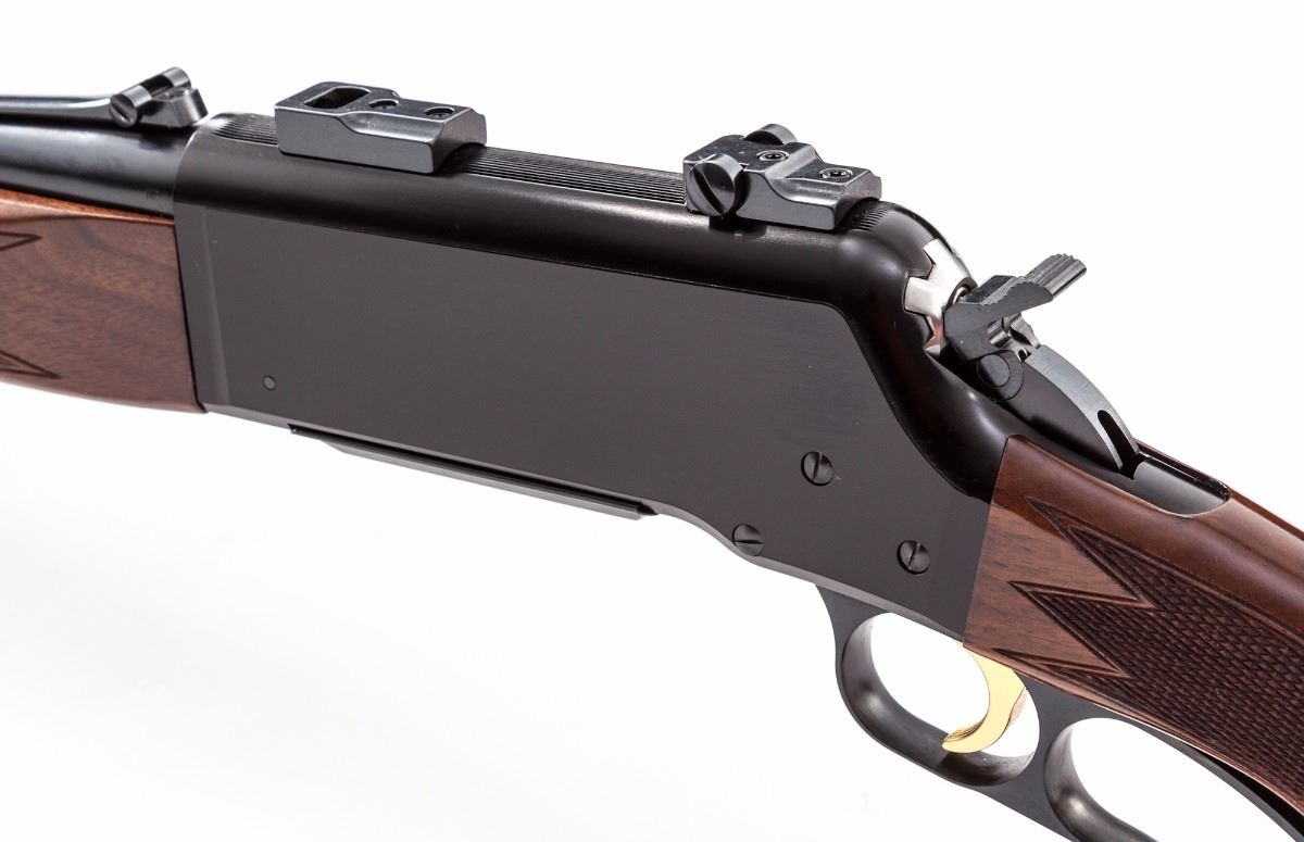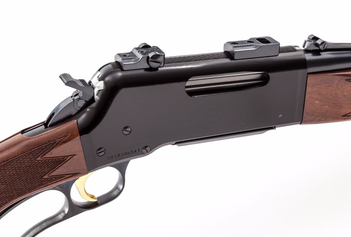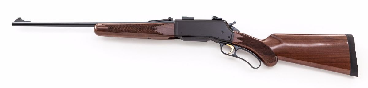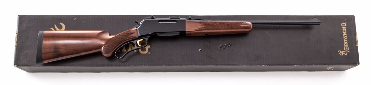 Browning BLR Lightning Lever Action Rifle, #02181NN341, .22-250 cal., 20'' barrel, dark blue finish, gold-plated trigger, high gloss checkered pistol-grip round knob walnut stock and forend, factory black rubber Browning recoil pad, with standard sights, one magazine, and fitted with two-piece scope base. In original box with matching end label. Made in Japan. Condition is excellent, appearing as new, with the exception of a few scattered impressions to the forend. Possibly unfired. Est.: $650-$850. (Modern)