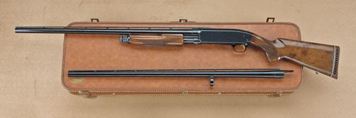 Browning BPS 12ga 2-barrel set, in factory luggage case, field grade, serial #25872RN152. Barrel #1 measures 32”, shows ventilated rib, marked for 2-3/4” and 3” shells, is full choked. Second barrel measures 28”, is choked modified, shows ventilated rib, is marked “for 2-3/4” and 3” shells. The gun shows browning recoil pad and measures 14-7/8” to the end of the hard-rubber pad. Shows stud in stock for QD swivel. The gun shows some carry and use, approx. 95-98%. Some small losses, blue on the frame, normal carry and use. The case is good and browning marked. Est: $400 - $800