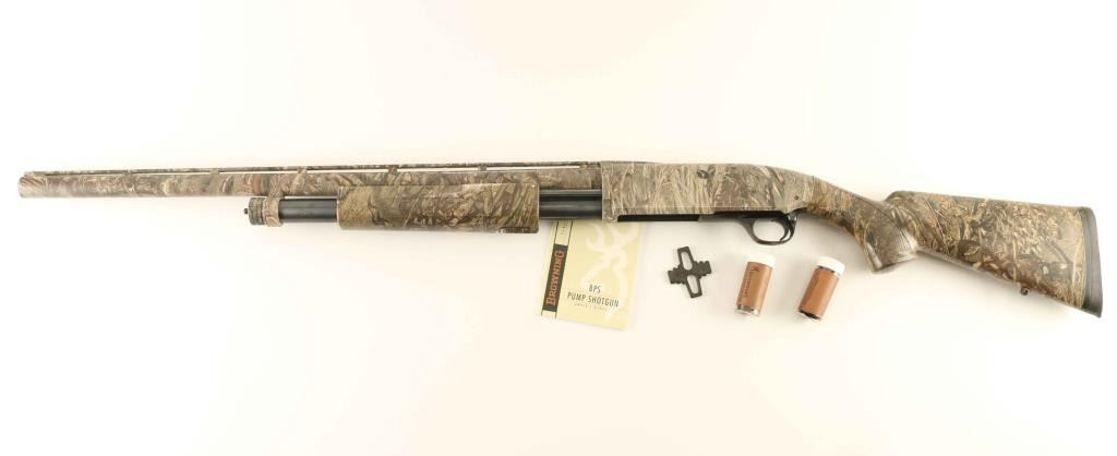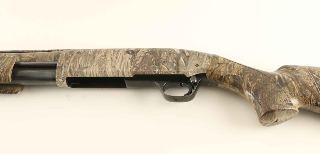 Bottom ejecting slide action shotgun chambered for 3 1/2" 10 gauge shells, manufactured in Japan by Miroku circa 2007. Features a Mossy Oak Duck Blind camo finish, 26" vent ribbed barrel with screw in improved cylinder choke, silver bead front sight, 2/3 length tube magazine, smooth wide trigger, sliding safety on the top of the steel receiver, alloy triggerguard, swivel studs, checkered synthetic slide handle and pistol grip shoulder stock with factory recoil pad & 14" LOP. Includes a factory choke tool and two addition factory chokes marked "Mod - Lead/ Full - Steel" & "Full - Lead Shot Only." Shotgun exhibits nearly all of it's camo finish showing light high point edge wear and scattered light surface rust on the blued magazine tube. Action is smooth, the bore is pristine and the synthetic stocks are very good++ with some small blemishes. Condition is near NRA Very Good+++. ***Modern Firearm***