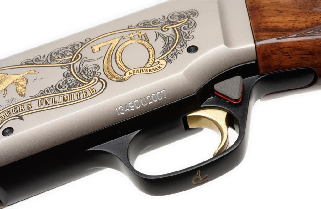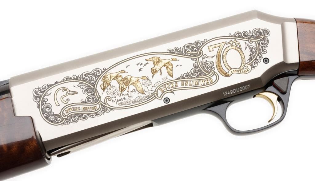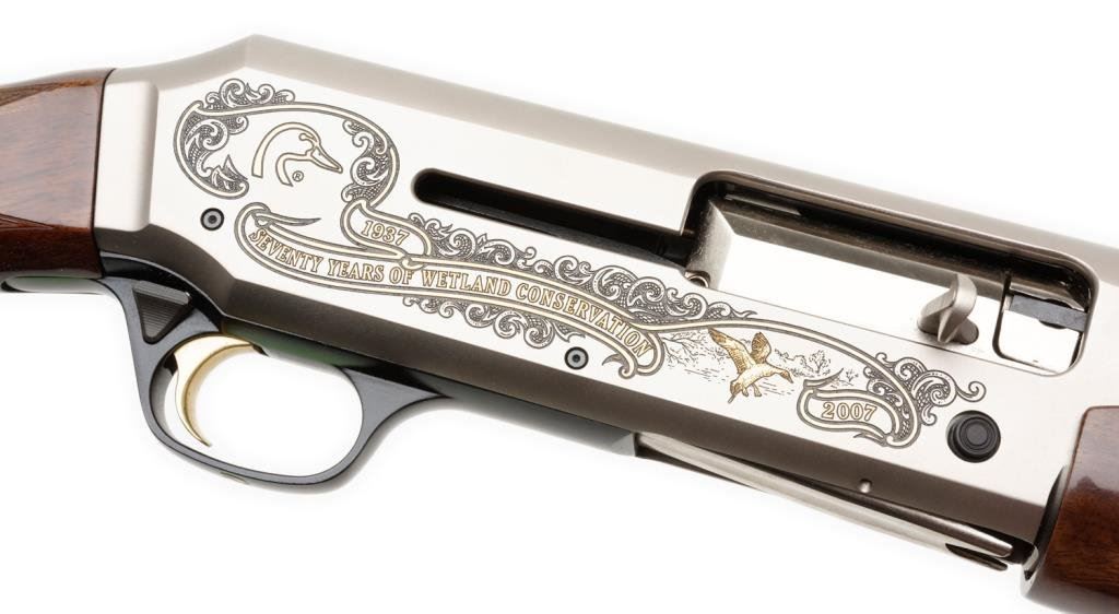 *Browning BPS semi-automatic shotgun, Ducks Unlimited Silver Hunter Model, 12 gauge, 28” ventilated rib barrel, S/N 1349DU2007, blued barrel, satin receiver with Ducks Unlimited ornamentation, checkered wood deluxe stocks in like new condition. Est.: $1,300-$2,100.