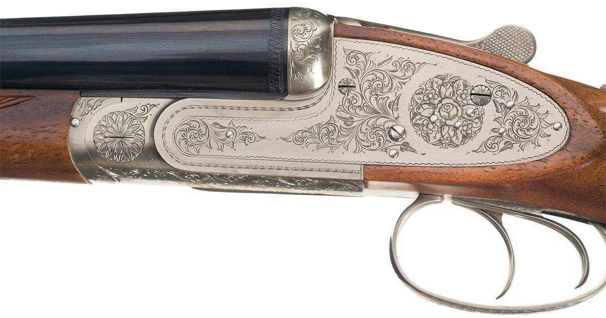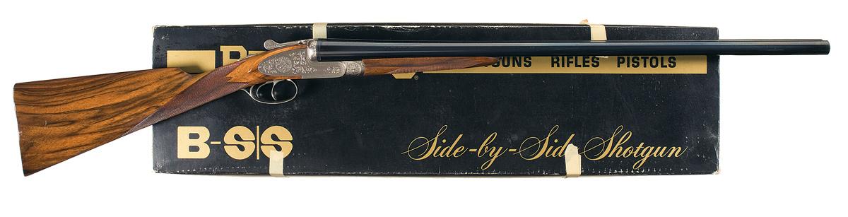 Manufactured in Japan. Single bead sight on a solid rib with 2 3/4" chambers, chokes marked improved cylinder and modified, with ejectors. Coin finished side lock action featuring a floral blossom and floral scroll engraving. Double triggers and tang selector. Checkered forearm and straight grip stock with skip line checkered bare butt. Length of pull is 14 1/4". Complete with factory box numbered to gun.