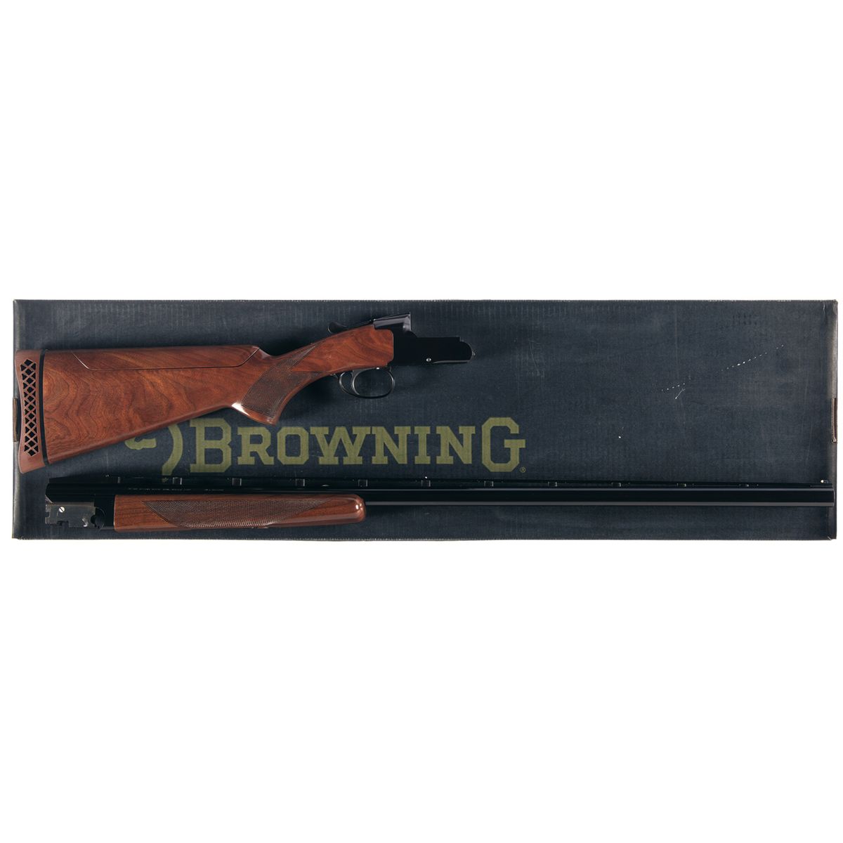 Introduced in 1968 and manufactured in Japan. Double ivory bead sights on high matte vent rib, 2 3/4 inch chamber, Invector Plus choke system, with ejector. Standard barrel markings, gold filled Browning buck head logo on the trigger guard, and mounted with a checkered walnut forearm and pistol grip stock with adjustable comb and browning vented rubber recoil pad. Length of pull is 14 1/2 inches. Complete with the original box numbered to the gun, with choke wrench and chamber lock.
