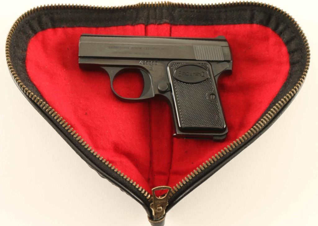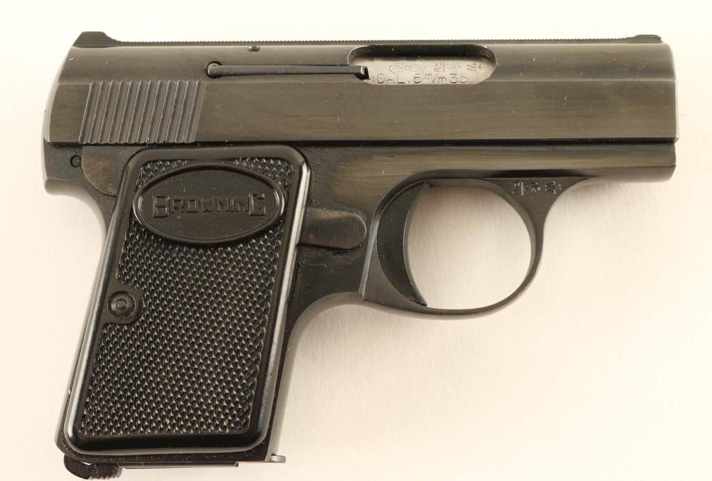Belgium made striker fired semi-automatic pocket pistol chambered in 6.35mm, manufactured circa 1968. Features a blued finish, 2" barrel, full-length steel guide rod, fixed sights, smooth trigger, manual safety/slide catch on the left side of the frame, magazine disconnect safety, heel magazine release, 6 round magazine, steel frame, and two-piece checkered black synthetic grips with Browning decor. Includes a Browning marked black leather belt holster and zippered soft pouch. Pistol retains approximately 98%+ original bluing showing a few small scattered blemishes on the right side of the slide. Action is sound, the bore is excellent and the synthetic grips are fine. Condition is near NRA Excellent. ***C&R Firearm***