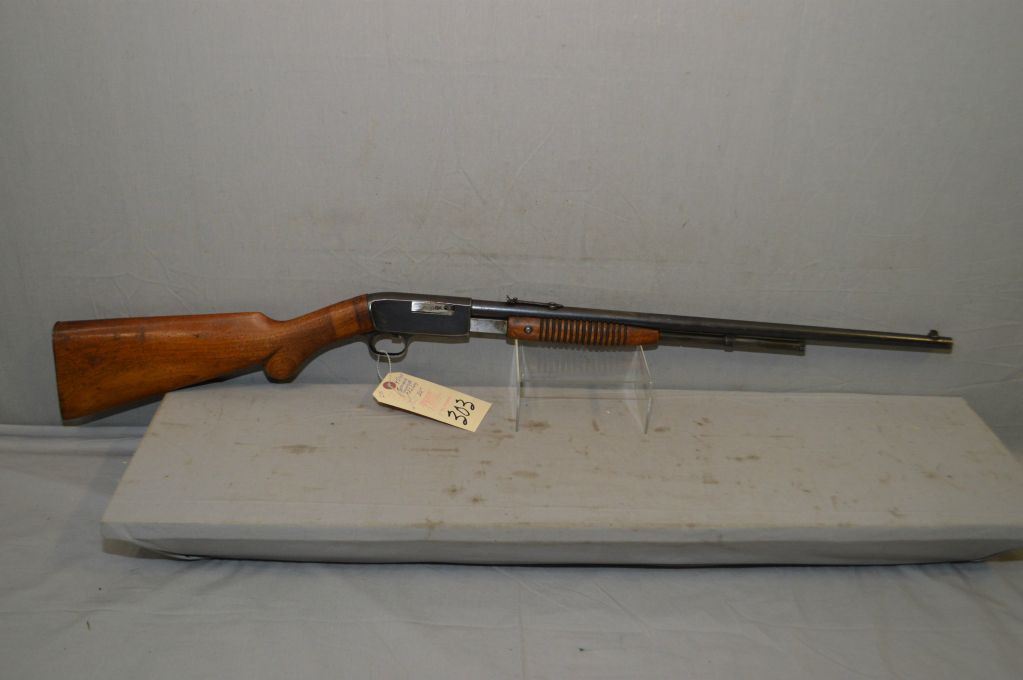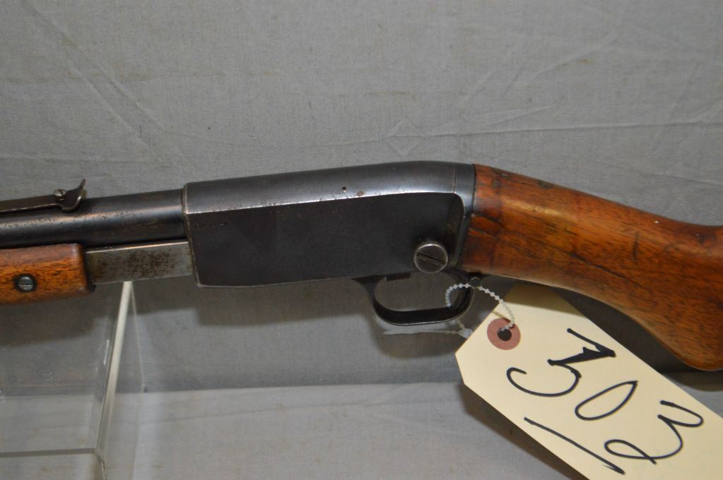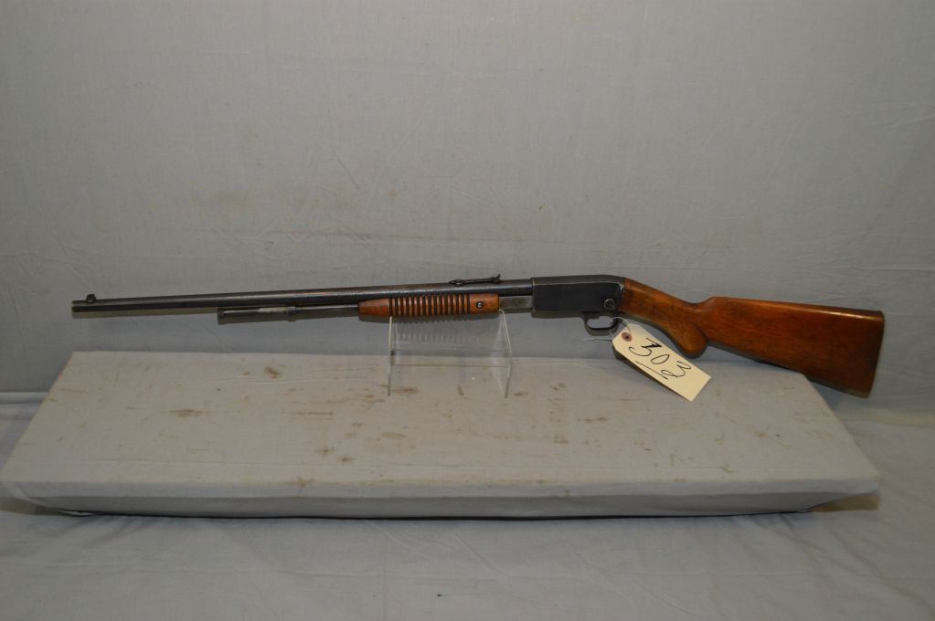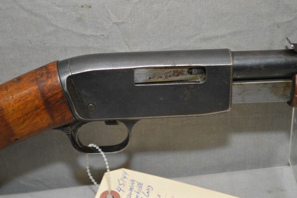 Browning ( Belgian ) Model Trombone .22 Long ONLY Cal Tube Fed Pump Action Rifle w/ 22" bbl [ blued finish , barrel sights, starting to fade, with some light pitting, rounded pistol grip stock w/multiple cracks behind receiver, appears to approx. four small screws inserted, good forend ] Ser # 45144