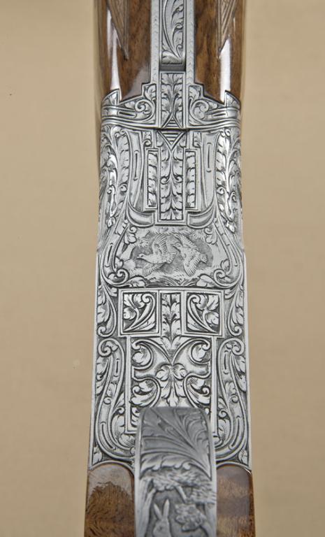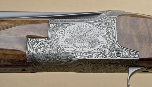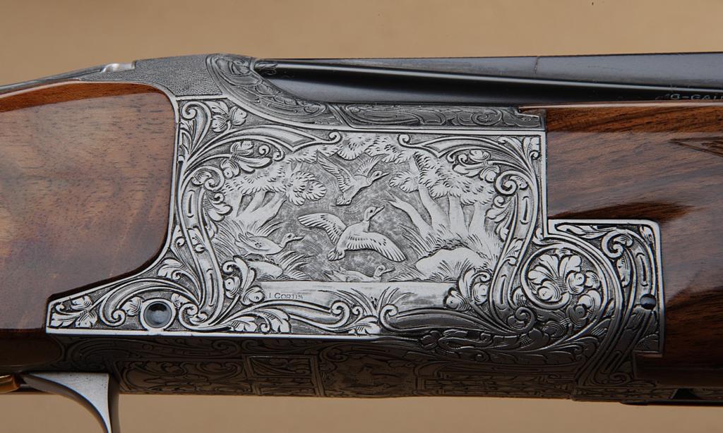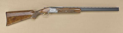 Browning Belgian-made Diana grade superposed 410ga shotgun, choked “Skeet” and “Skeet” with 26-1/2” barrels, ventilated rib, signed “I. Cortis” on both sides of the frame. The gun remains in fine to excellent originalcondition showing 99% plus original blue, satin grey frame, showing very slight darkening. The stocks are near excellent with a couple of minor storage marks which are miniscule. The original hard-rubber butt isretained and the gun is full length and has been used slightly. The original box is in fair to good condition with some scuffing. The original label is folding and becoming fragmented. The gun is serial #2131J8 andmatches the label. From the Robert Petersen collection. Est: $5,000 - $10,000