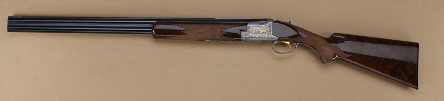 Browning Belgian-made superposed, 12ga over/under shotgun, pointer-grade, 28” barrels, choked “Full” and “Modified”. Single trigger, ventilated rib, factory deluxe checkered stocks, hard-rubber buttplate,serial #56637S76, in Browning-type carrying luggage case. The left side of the frame is signed “Vrancken” and “G. C. Baerten”, who are in our opinion the top pair of Browning engravers in this era. The gun is in fine toexcellent condition, 98-99% plus, only slight use, minor storage, a couple of marks in the stock. The stock is full length, 98-99%. From the Robert Petersen collection. Est: $6,000 - $12,000