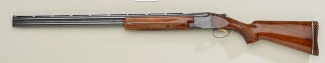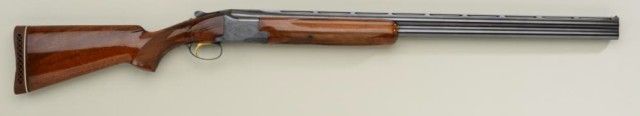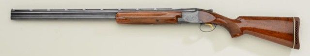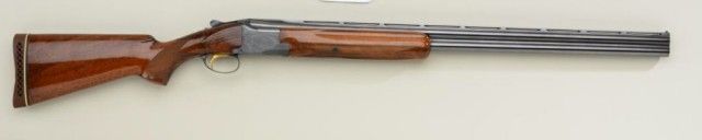 Browning Belgium made Broadway trap 12 gauge shotgun factory 30" barrel with wide rib, single trigger, auto ejector, long tang with squared pistol grip. Serial #11464S3. The gun is marked 1 star over 2 stars and ischoked about full and mod. The gun retains 96-98% original blue, the stocks have been professionally recoated with poly-urethane finish and no sanding, couple of minor scratches from storage and use. Bore showssome wear and are very good and may clean. The stock measures 13" to the end of the wood 14" to the end of the hard rubber Browning pad. Robert I Petersen collection. Est.; $800.-$1,600.