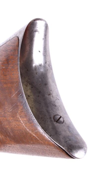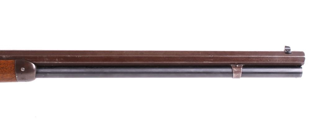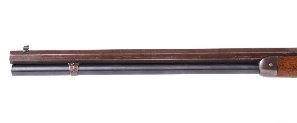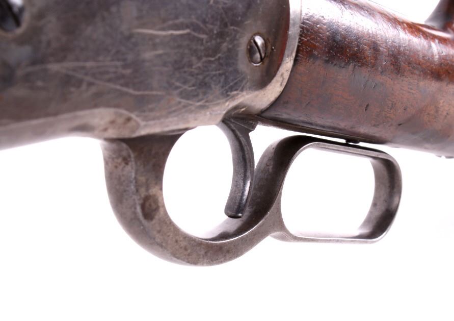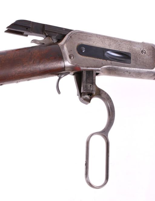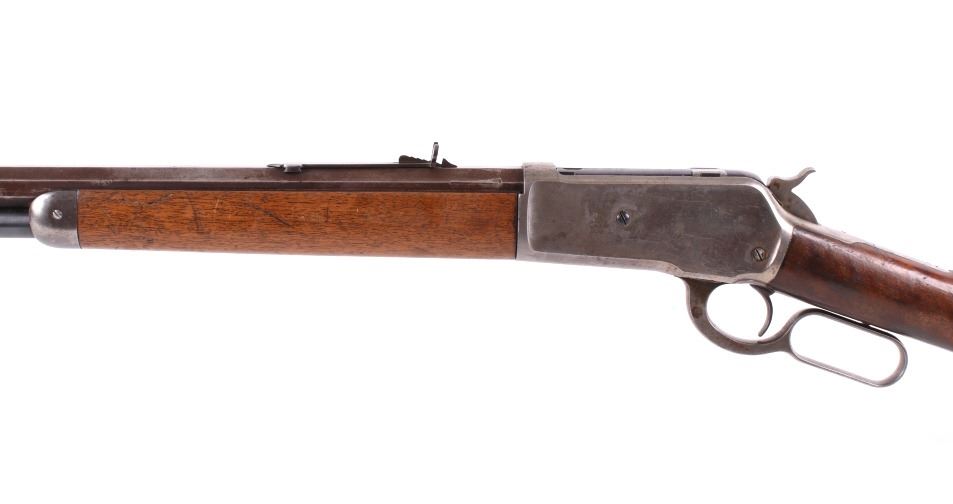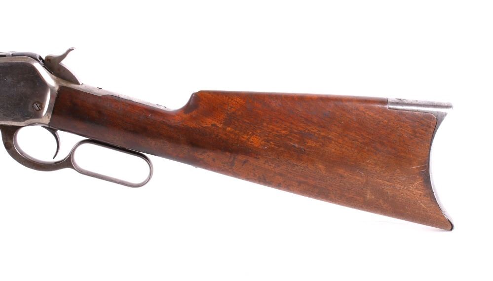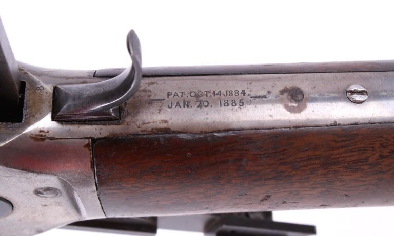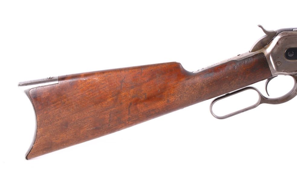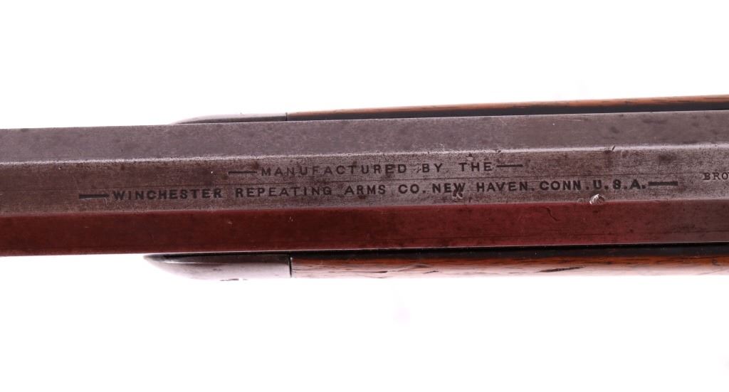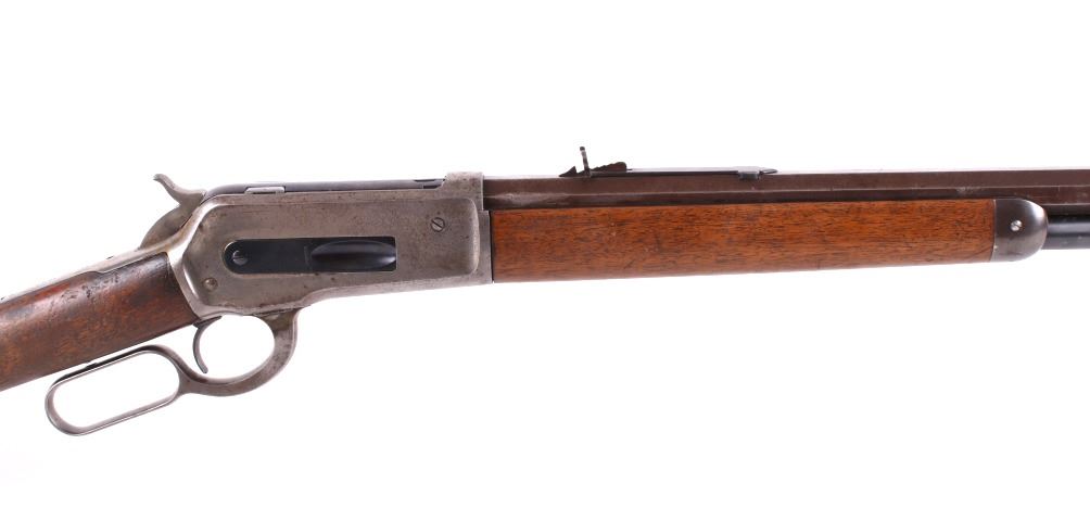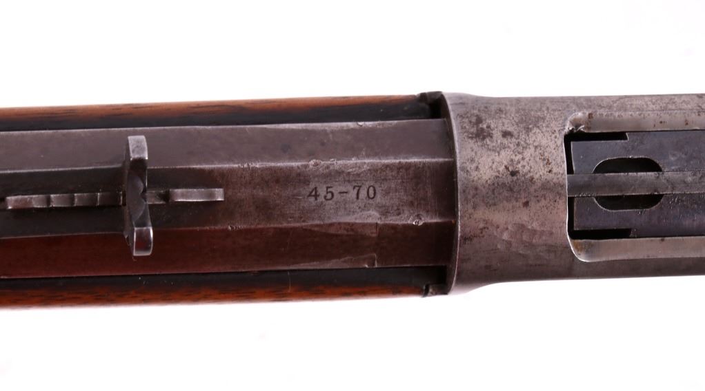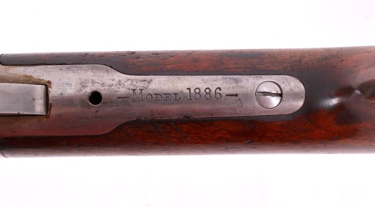 For sale in this lot is a Winchester Model 1886 Lever Action rifle, chambered for the popular .45-70 cartridge. The rifle is an early production model, dating to manufacture year 1891. The Model 1886 was designed by the renowned John Browning, and was intended to be used with some of the most powerful cartridges of the time, including .45-70, .45-90, and .40-82. Despite being originally designed for use with black powder, the action was strong enough to make the jump to smokeless powder with only minor modifications. Winchester bought the Patents from John. M. Browning and paid him a small percent in cash, then they paid him off in full by shipping completed ready to sell firearms to their retail shop in the Utah Territory which they operated in the 19th century. Those firearms after being received in Ogden, Utah were then stamped "BROWNING BROS. OGDEN U.T." on the top of the barrel between the Winchester address stamp and the front of the rear sight. After Utah became a state in 1896, the stamp was changed to "BROWNING BROS. OGDEN U." This example utilizes a 26" octagonal barrel, adjustable ladder rear sight, paired with a blade front sight, and showing a patina'd blue finish, contrasted by excellent walnut fixtures. The rifle is correctly marked, reading; "Model 1886" on the upper-tang, "PAT OCT. 14 1884 - JAN. 20 1885" on the lower-tang, ".45-70" on the upper of the barrel, behind the rear sight, and "Manufactured by the - Winchester Repeating Arms Co. New Haven, CONN. U.S.A. - BROWNING BROS. OGDEN U.T." on the upper of the barrel. Overall, the rifle shows good mechanical condition. The action is tight, and the barrel shows strong rifling with some darkness. Serial Number: 59022. This firearm qualifies as an Antique, and does not require FFL Transfer or NICS Background Check.