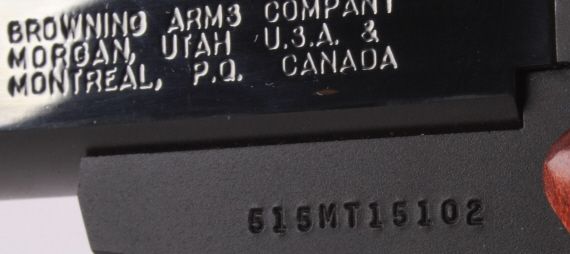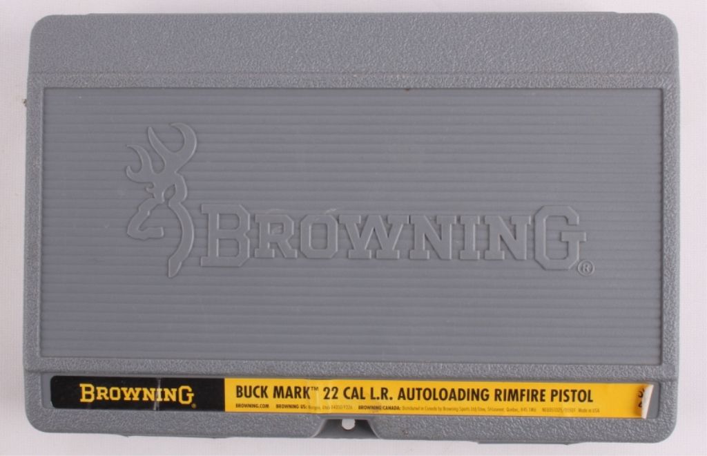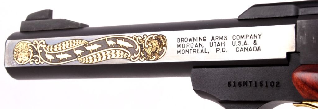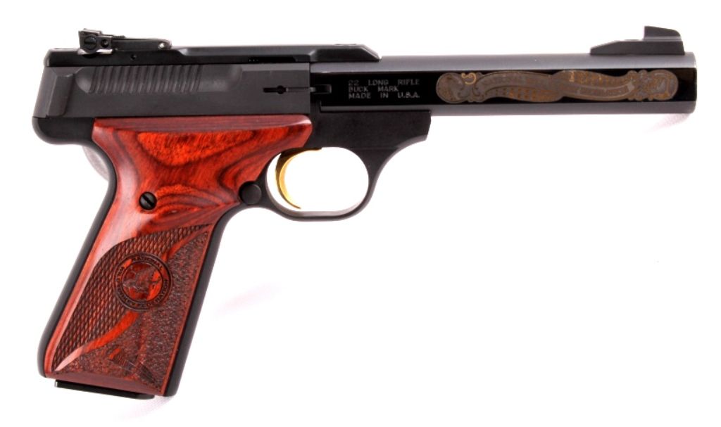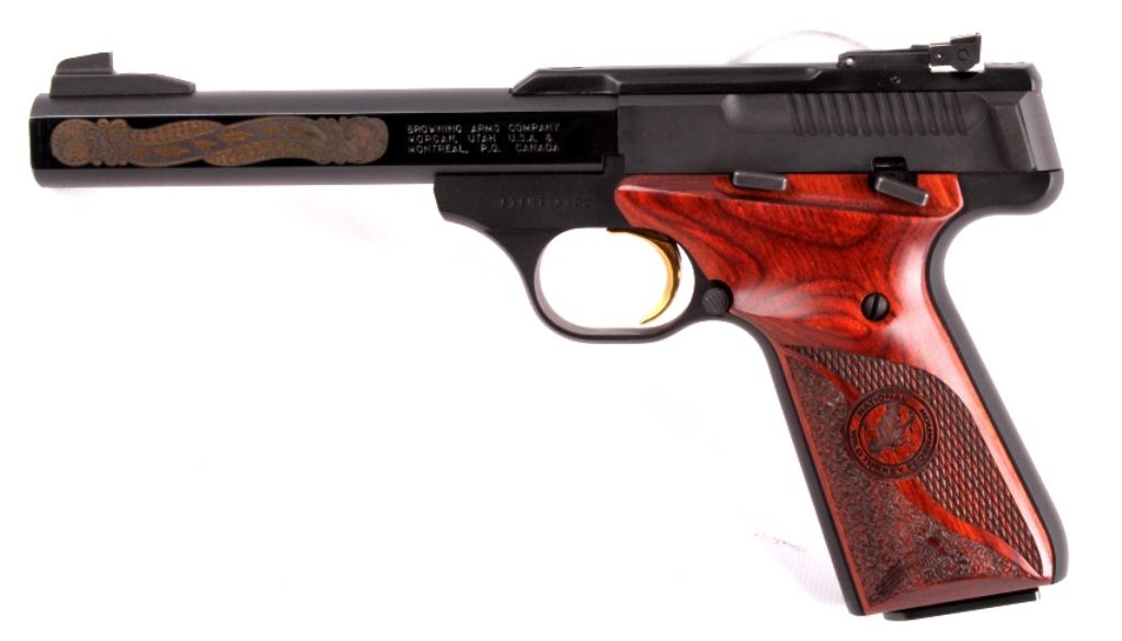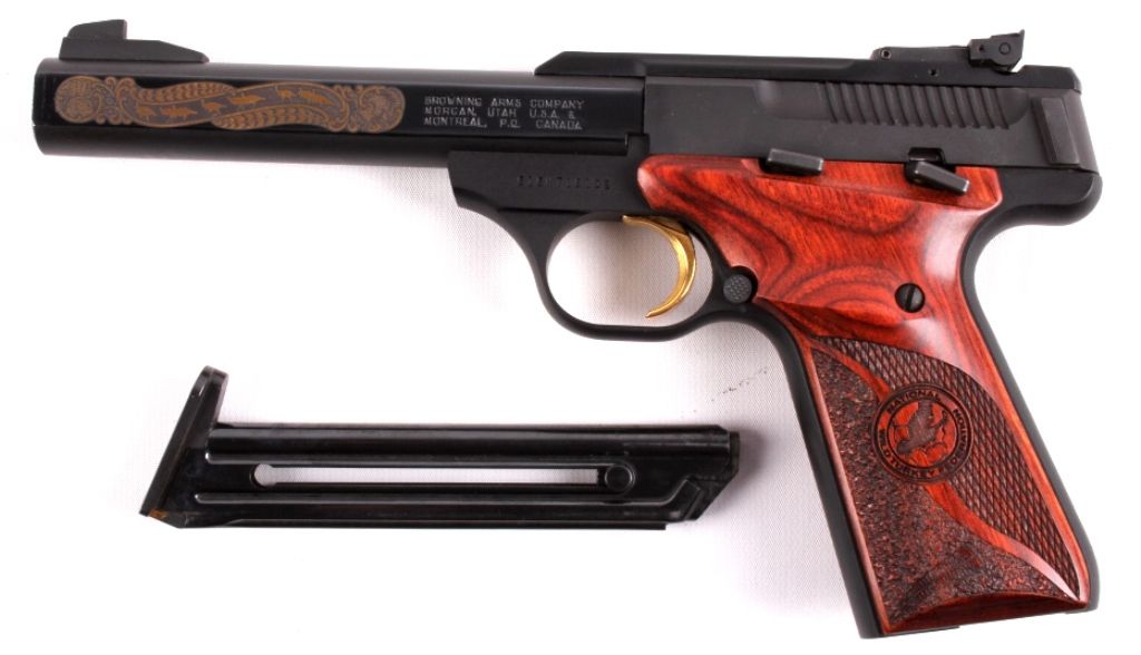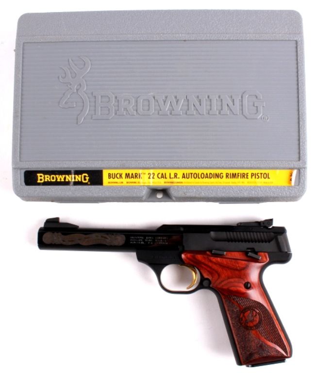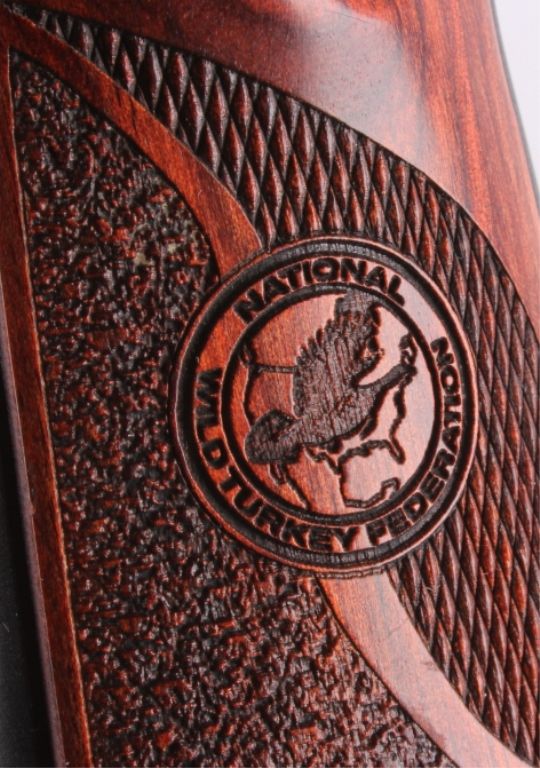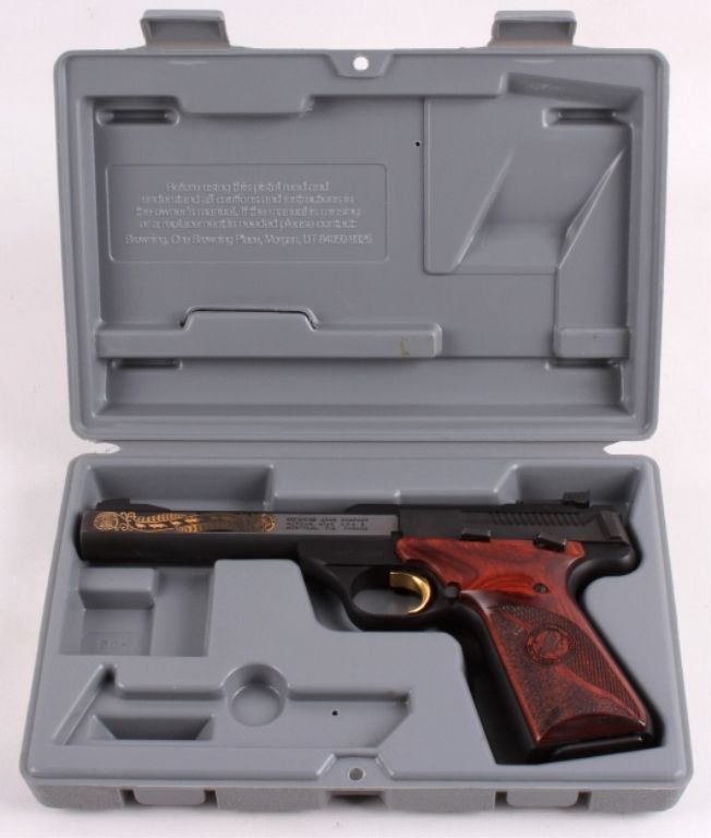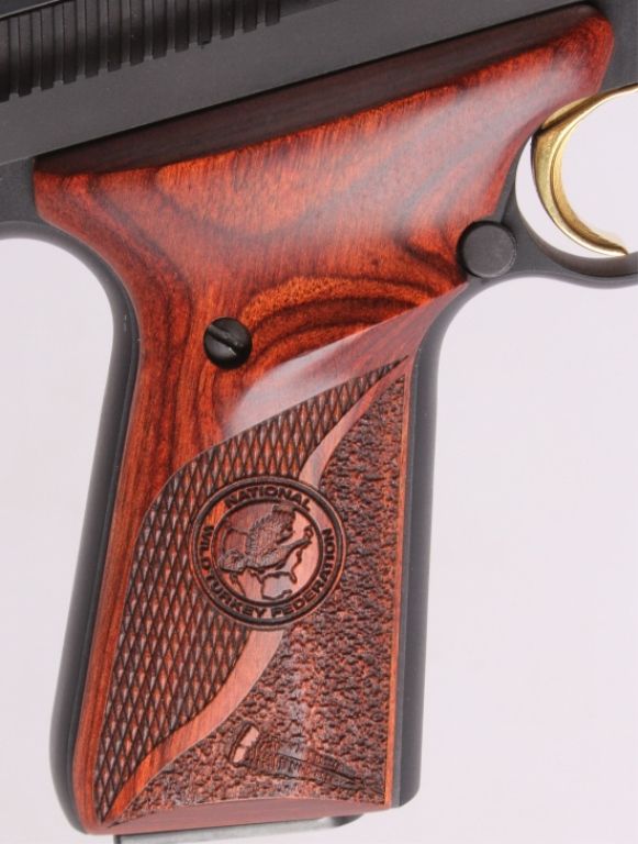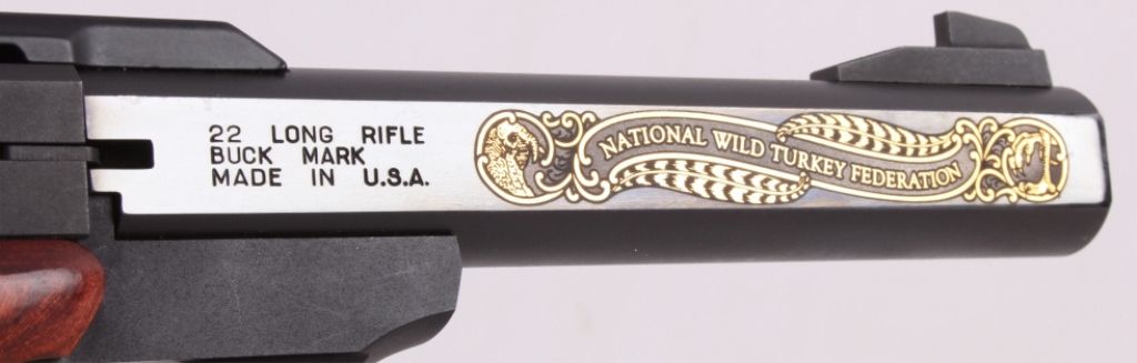 This is a rare special edition National Wild Turkey Federation Browning Buck Mark .22 LR auto loading hand gun. The gun comes with the serial number matching Browning hard case and is in mint condition, believed to havenot been fired. The gun has wonderful engraved art across both sides of the barrel. This very rare gun has mint condition carved wood grips showing a deluxe checkering and carved NWTF logo in the side. This has a 51/2" bull slab sided barrel