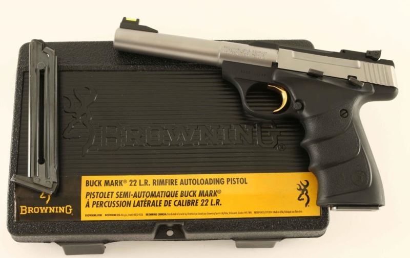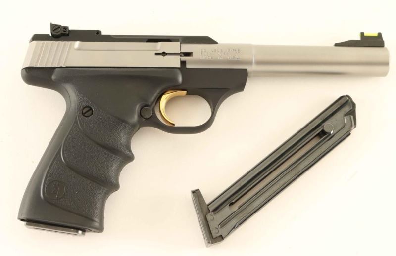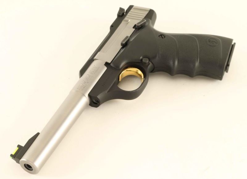 'Camper Stainless URX' American made blowback-operated single action semi-automatic target pistol chambered in .22 Long Rifle, manufactured circa 2010. Features a matte finished 5 1/2" stainless steel tapered bull barrel, green TruGlo fiber optic front sight, Pro Target adjustable rear sight, machined cocking tabs on the rear on the slide, manual safety on the left side of the frame, partially serrated gold trigger, manual safety on the left side of the frame, magazine disconnect safety, push button magazine release, factory 10 round magazine, matte black finished alloy frame, and one-piece textured black rubber wrap-around finger groove grip with Browning insignias. Includes the original factory cardboard box with documents, lock, spent case and spare magazine. Pistol exhibits little to no visible wear. Action is smooth, the bore is pristine and the rubber grips are fine. Condition is like NRA Perfect in case. ***Modern Firearm***