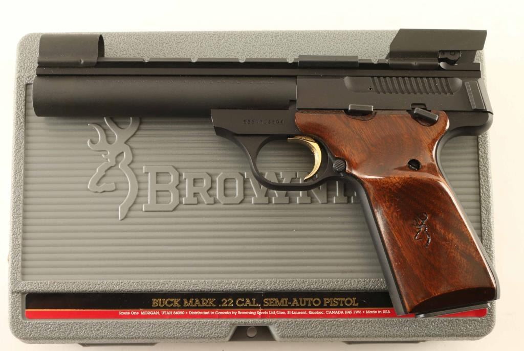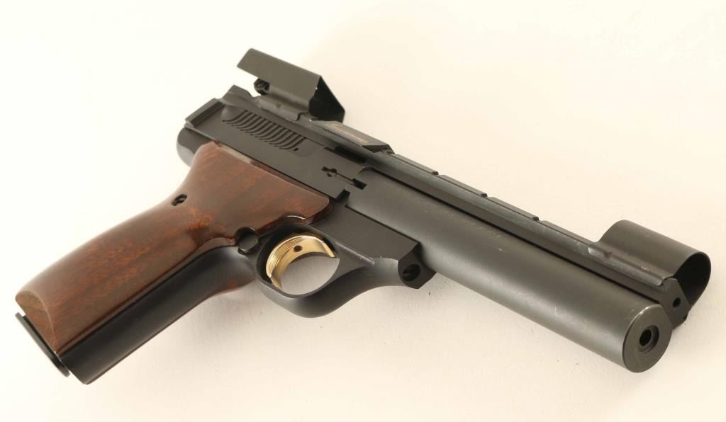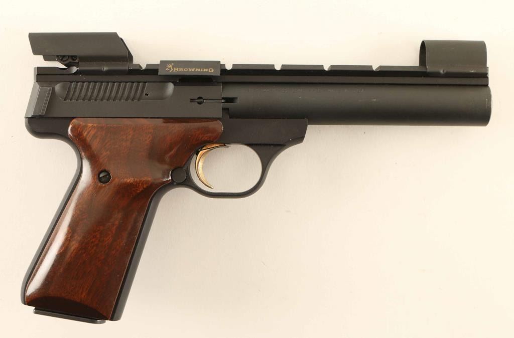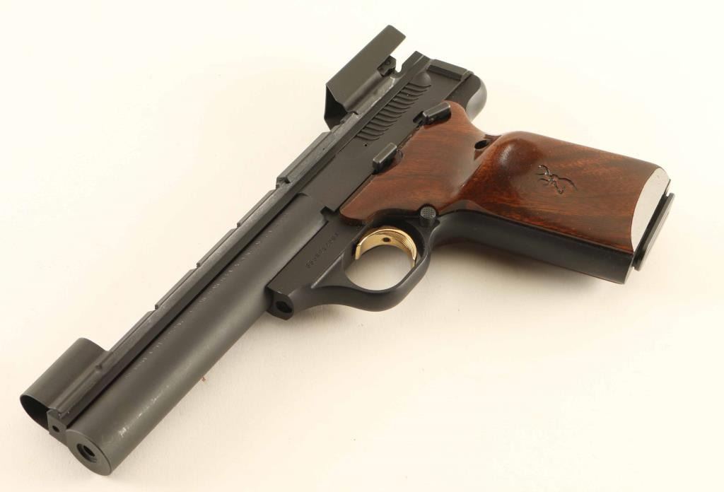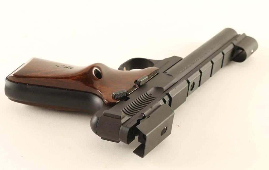 '5.5 Target SE' American made blowback-operated single action semi-automatic target pistol chambered in .22 Long Rifle, manufactured circa 1997. Features a matte blued/black finish, 5 1/2" bull barrel with recessed crown, shrouded post front sight, shrouded adjustable rear sight, optic rail with installed shell deflector, machined cocking tabs on the rear on the slide, partially serrated gold trigger, concealed hammer, manual safety on the left side of the frame, magazine disconnect safety, push button magazine release, 10 round factory magazine, alloy frame, and two-piece walnut target grips with thumb rest & Browning insignia on the left panel. Includes the original factory hard case with manual and tools. Pistol exhibits approximately 98% of it's original finish showing only a few scattered handling marks with no major wear observed. Action is smooth, the bore is pristine and the wood grips are fine. Condition is NRA Excellent in case. ***Modern Firearm***