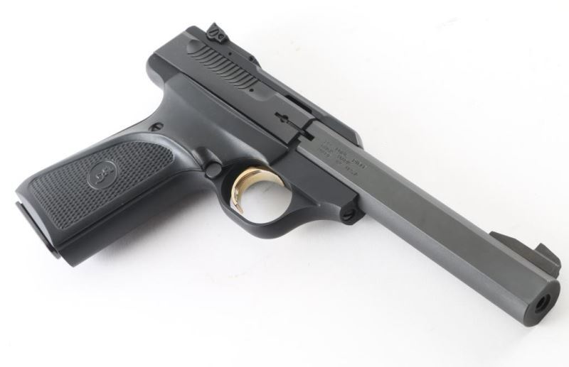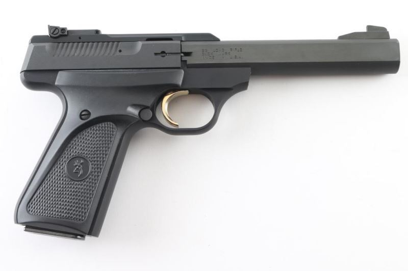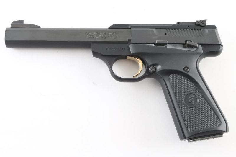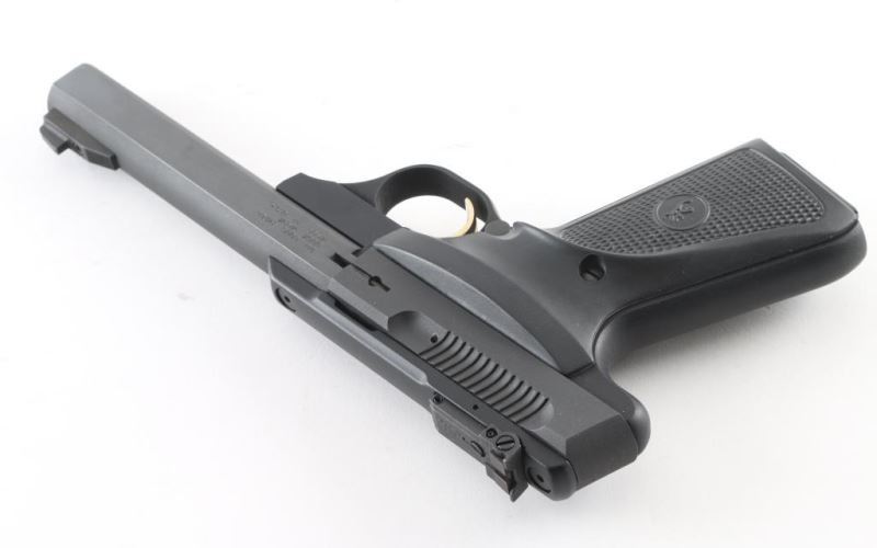 Semiautomatic rimfire pistol features matte blued finish with bright blued sides of barrel, 5.5" slab side heavy barrel, manual safety, adjustable sights, thumb button mag release, gold color accent trigger, black rubber grips with thumb groove. Bore is excellent and overall condition is like new. Includes (1) magazine. Condition is NRA Excellent - like new *** Modern Firearm ***