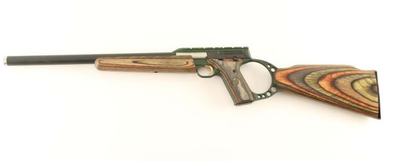 SN: 213MY05527 'Forest Green Limited Edition' Scarce limited production variation of the semi-automatic rifle chambered in .22 Long Rifle, circa 2002. Green & matte black finish, 18" carbon composite bull barrel with no provision for sights, scope rail, gold trigger, push button magazine release, 10 round magazine, thumb safety, and green laminated wood stocks. Includes the original factory cardboard box with documents, lock & spare magazine. Rifle shows minimal handling marks and a small amount of what looks like a beige paint on the left pistol grip panel & scope rail. Action is smooth, bore is pristine and wood stocks are fine. Condition is near new in box. ***Modern Firearm***