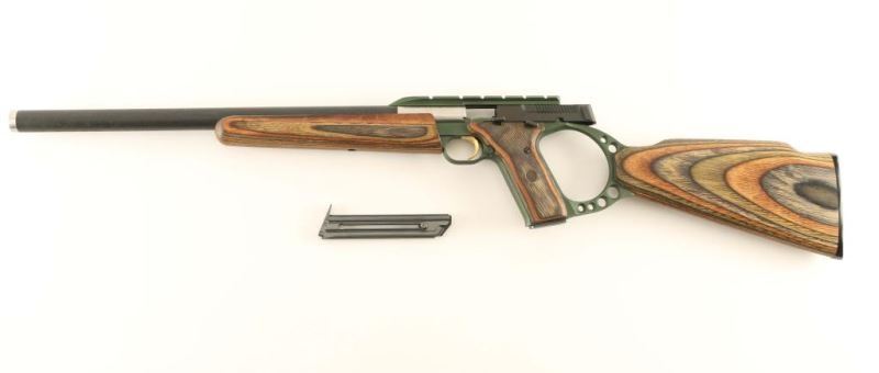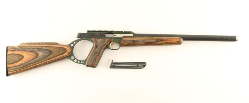 SN: 213MY05828 'Forest Green Limited Edition' Scarce limited production variation of the semi-automatic rifle chambered in .22 Long Rifle, circa 2002. Green & matte black finish, 18" carbon composite bull barrel with no provision for sights, scope rail, gold trigger, push button magazine release, 10 round magazine, thumb safety, and green laminated wood stocks. Includes a spare magazine. Rifle shows light handling marks and scuffs. Action is smooth, bore is pristine and wood stocks are fine. Condition is excellent. ***Modern Firearm***