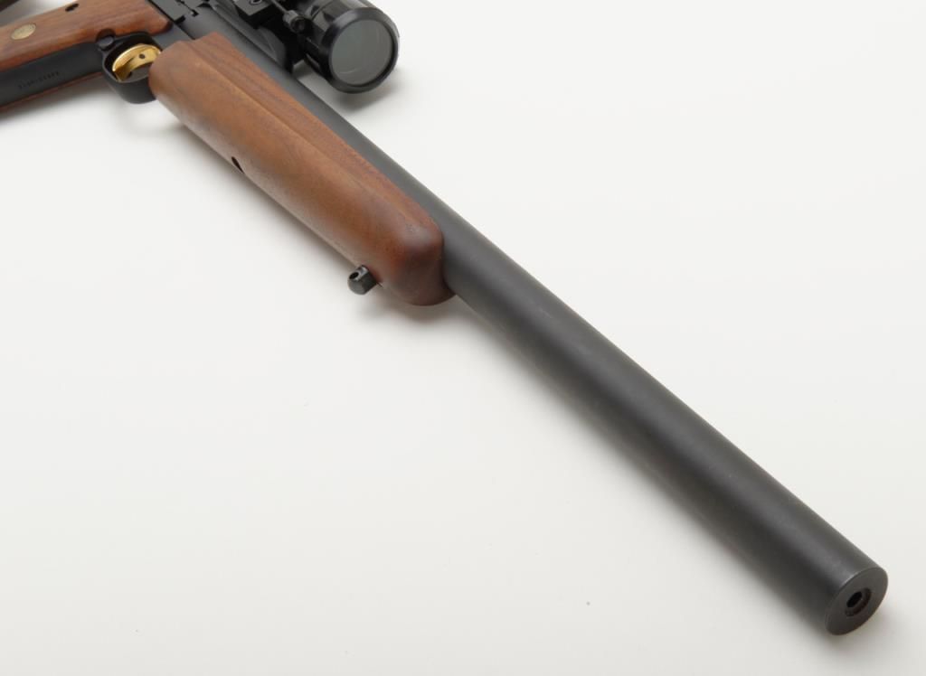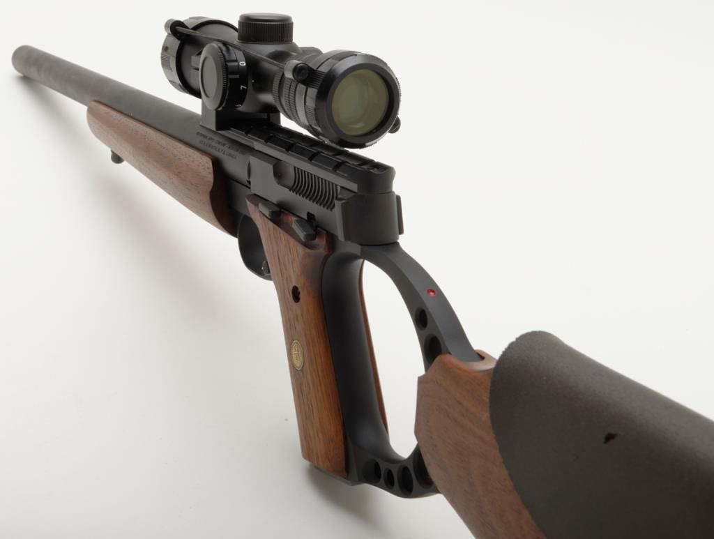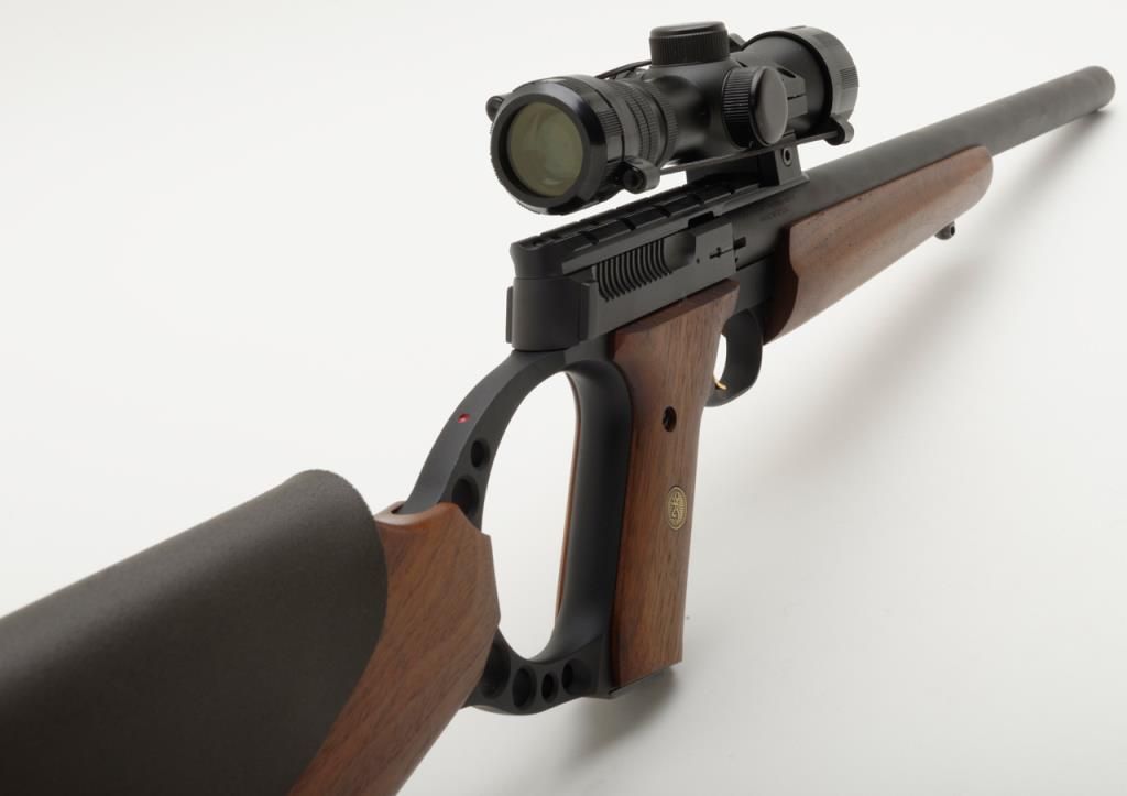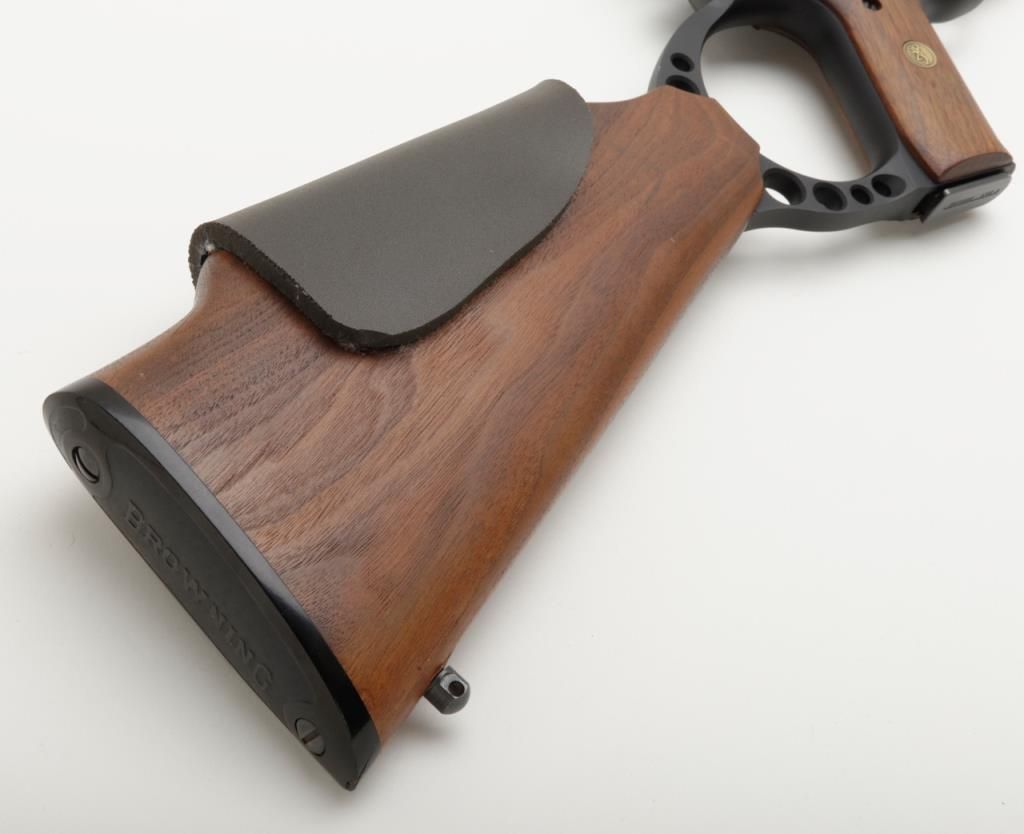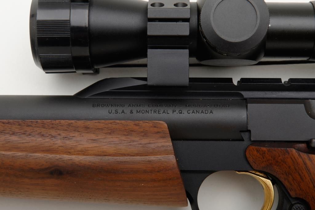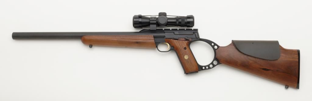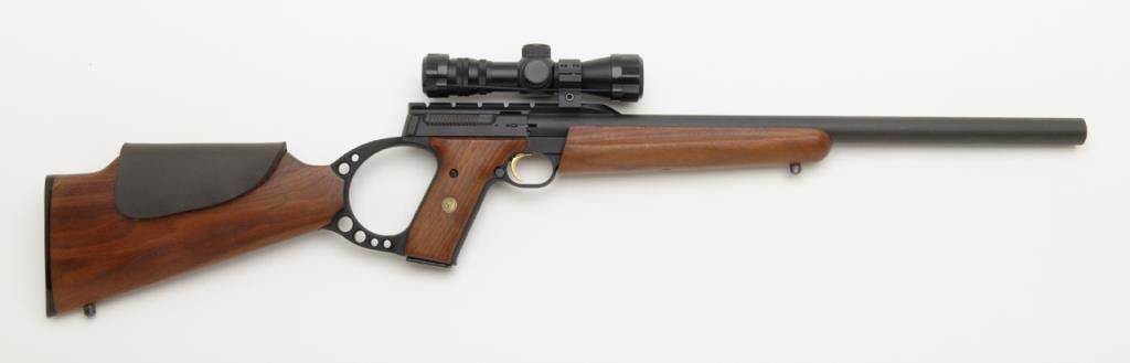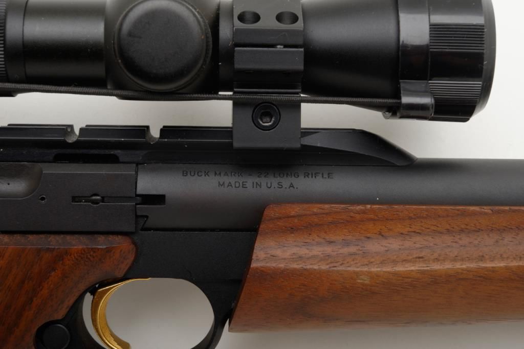 Browning Buckmark .22 caliber semi-automatic rifle with 18” barrel and thumb hole stock, mounted with 4x scope, in very good to near fine used condition, sling swivels and nylon cheek piece added. Est.: $300-$600