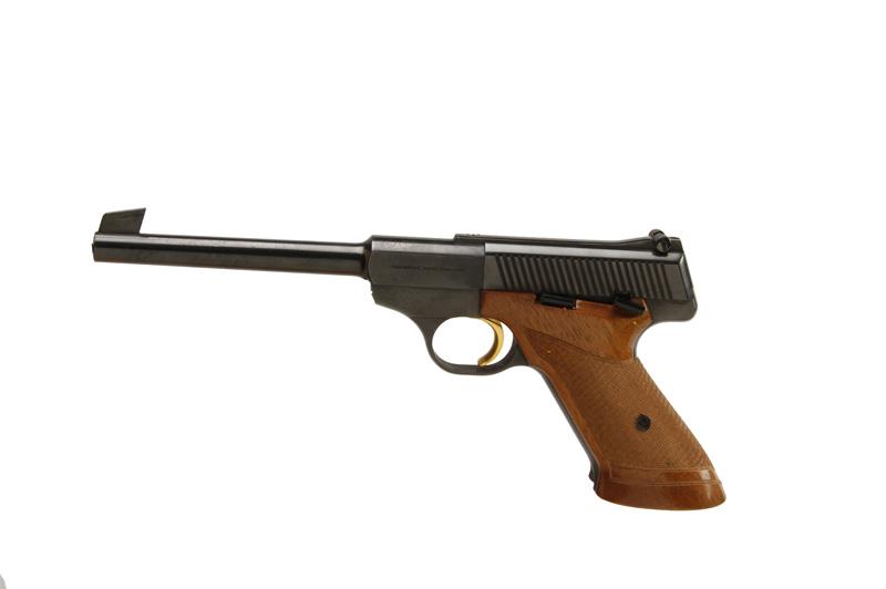 Condition: Excellent with little sign of wearSingle action semi auto target pistol made by Browning in Belgium. Blued finish, checkered wood target grips, 6 3/4" barrel, adjustable sights, good bore and action. Condition: Excellent with little sign of wear oruse.NO MAGAZINE.