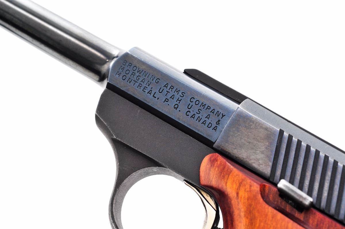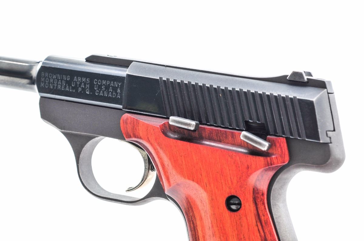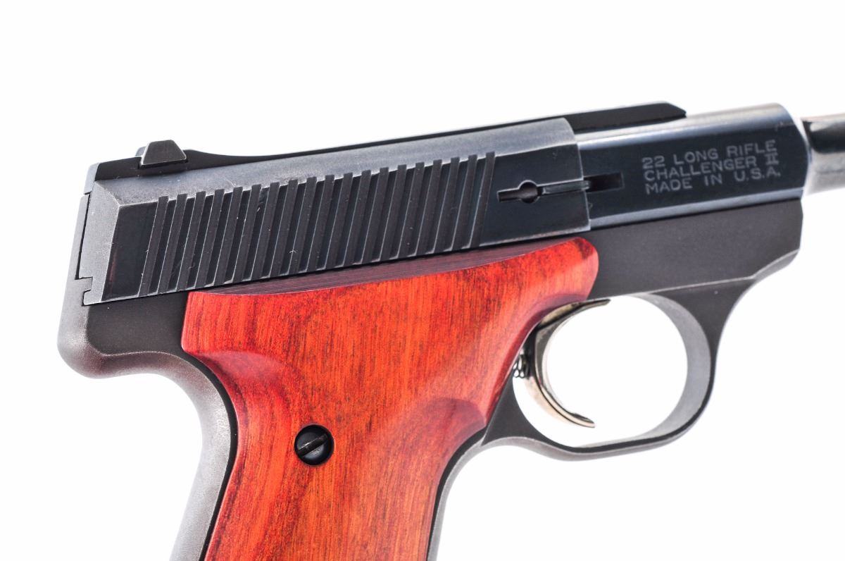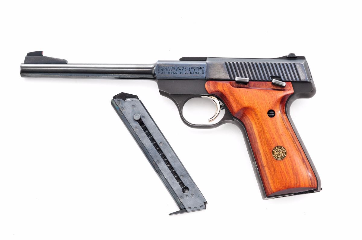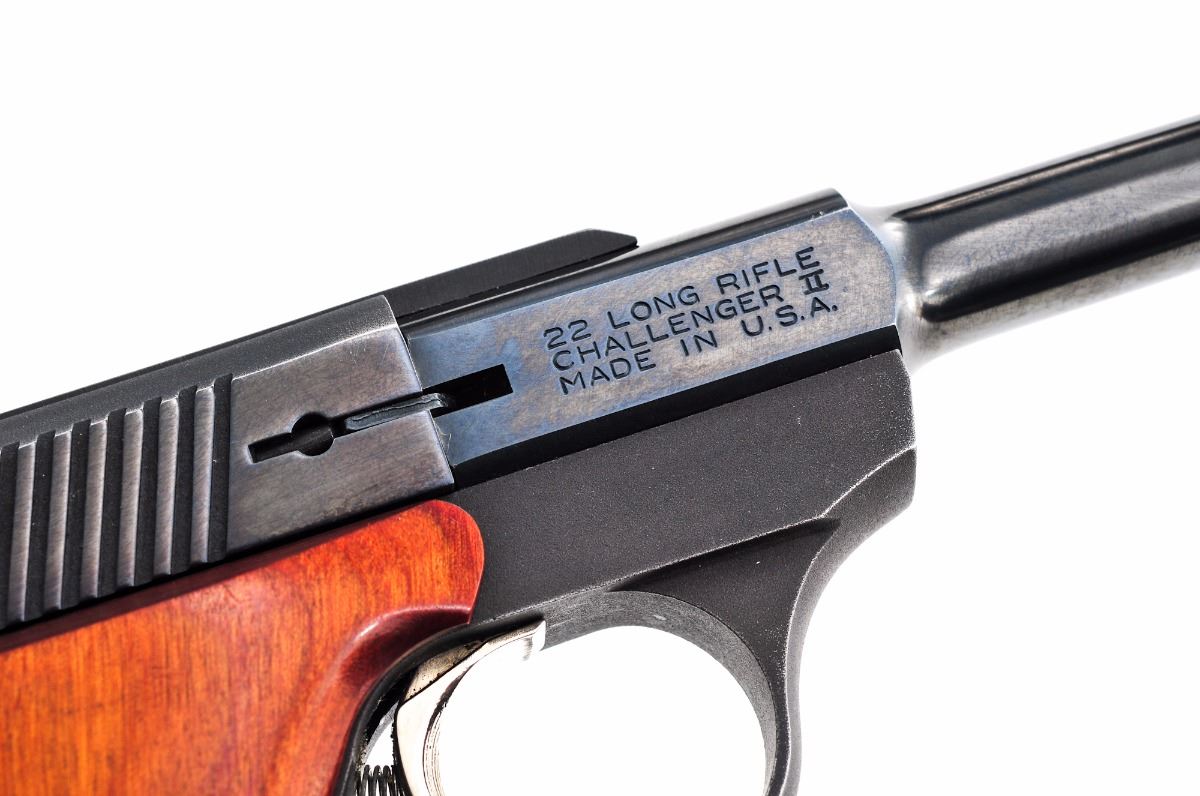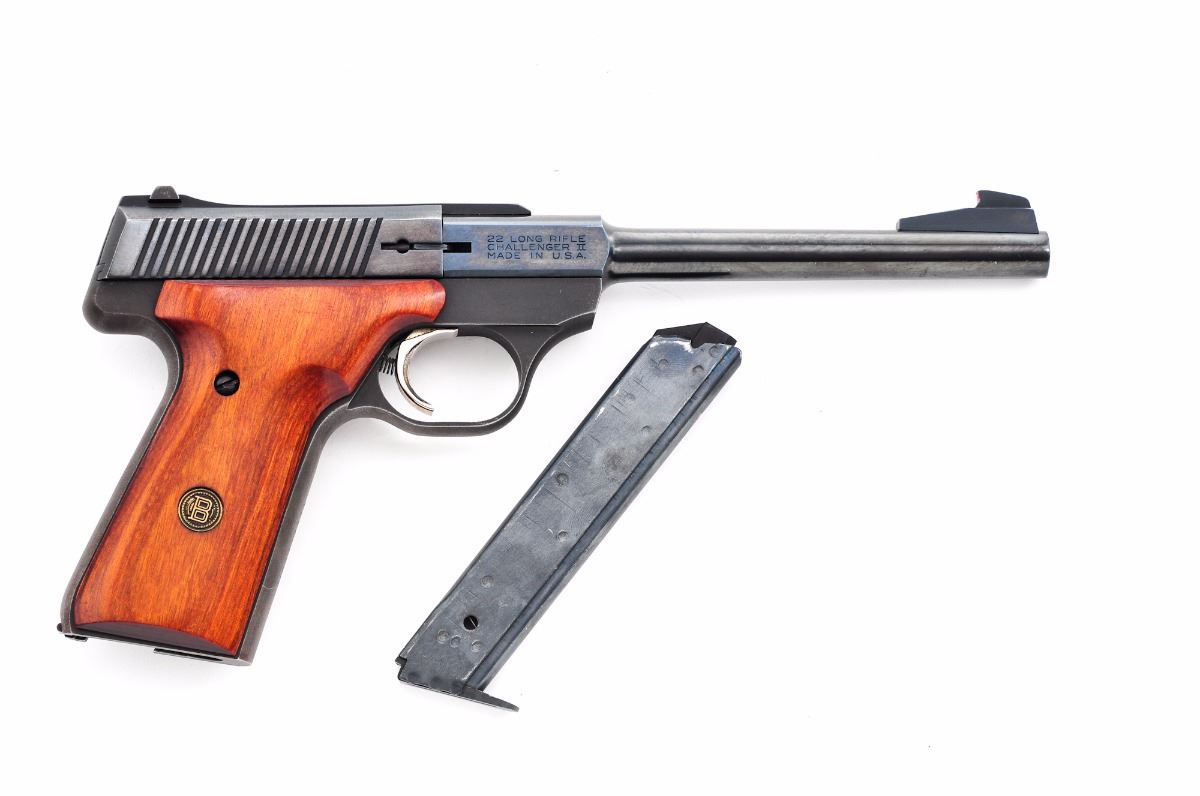 Browning Challenger II Semi-Automatic Pistol, #655PZ06222, .22 LR cal., 6-3/4'' barrel, blue finish, smooth walnut grips, ramped blade front sight and dovetailed square notch rear sight, with one extra magazine. Condition is excellent retaining approx. 98% original blue with thinning to front and rear straps. Grips are excellent with small ''ring'' marks to the left panel. Est.: $200-$350. (Modern/PPT)
