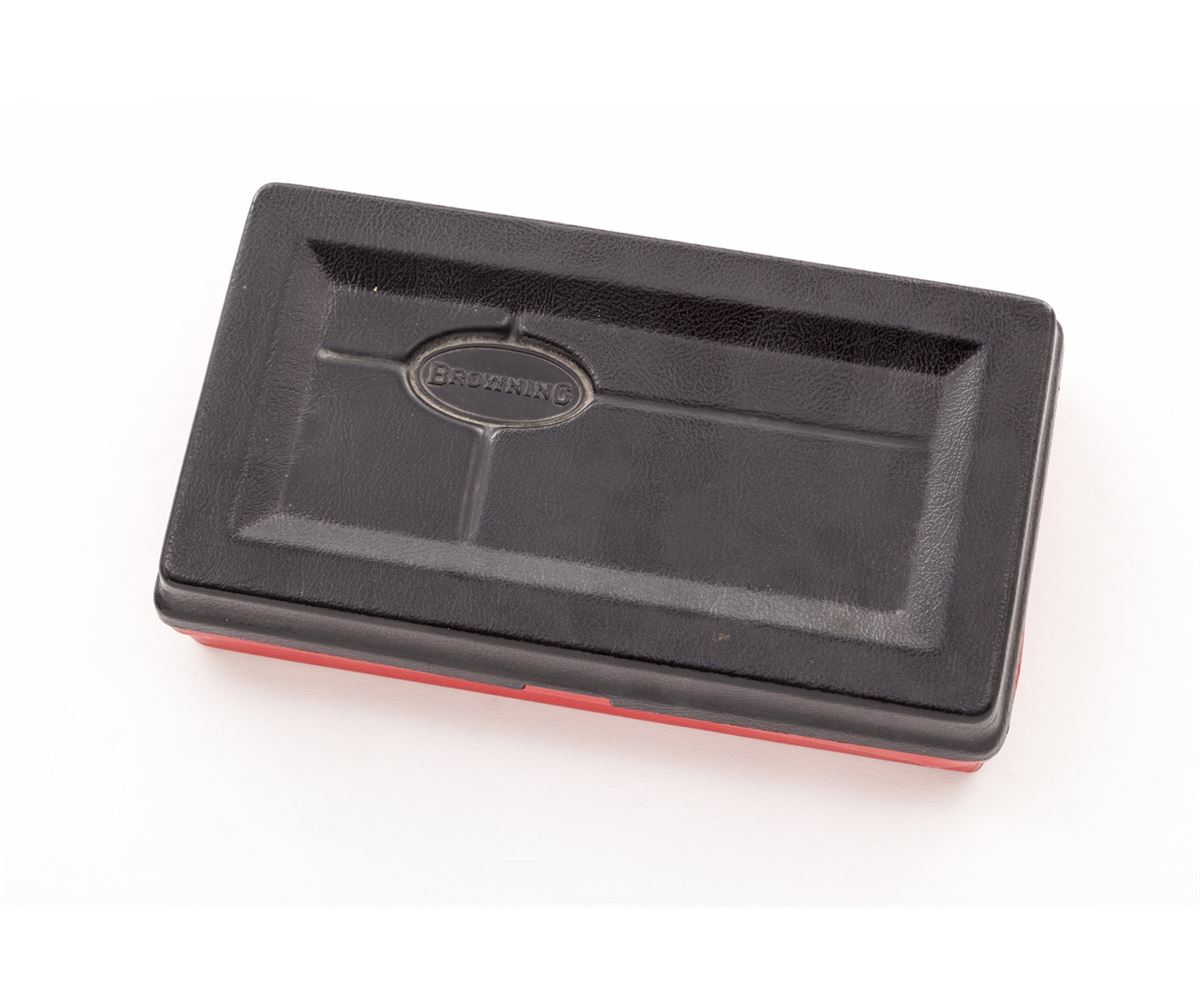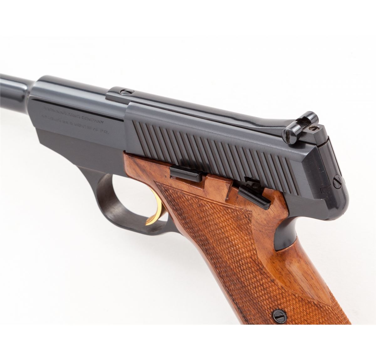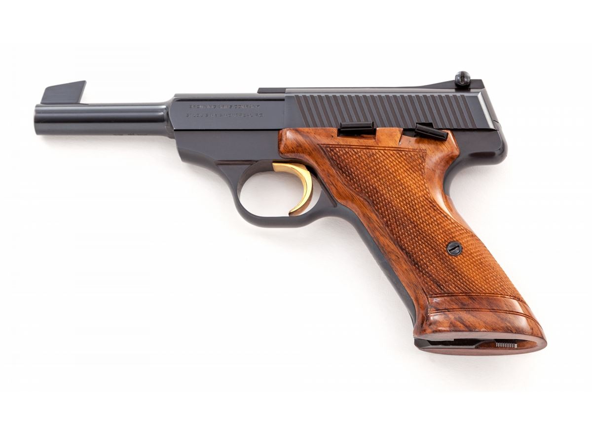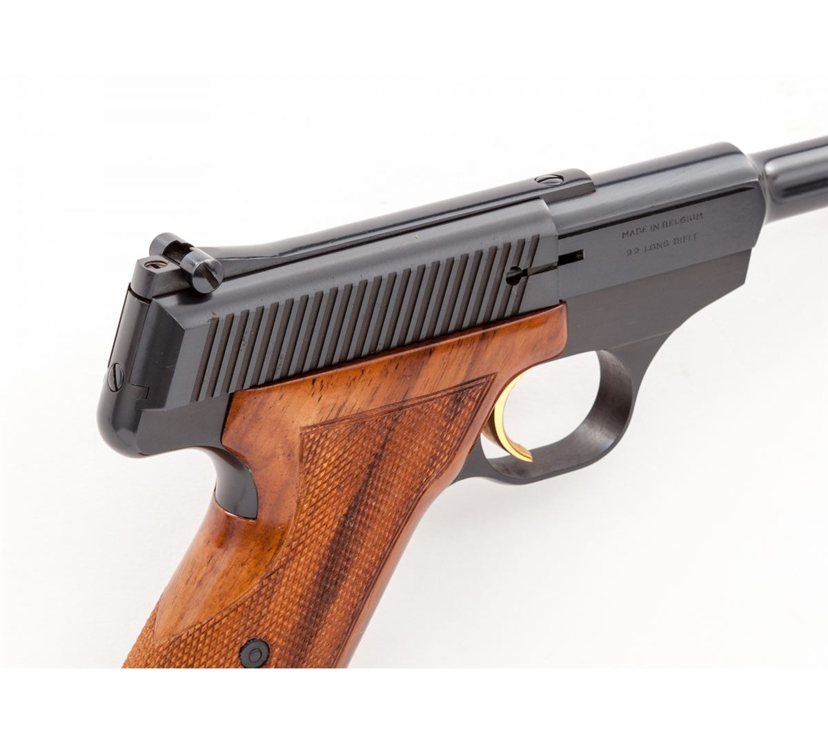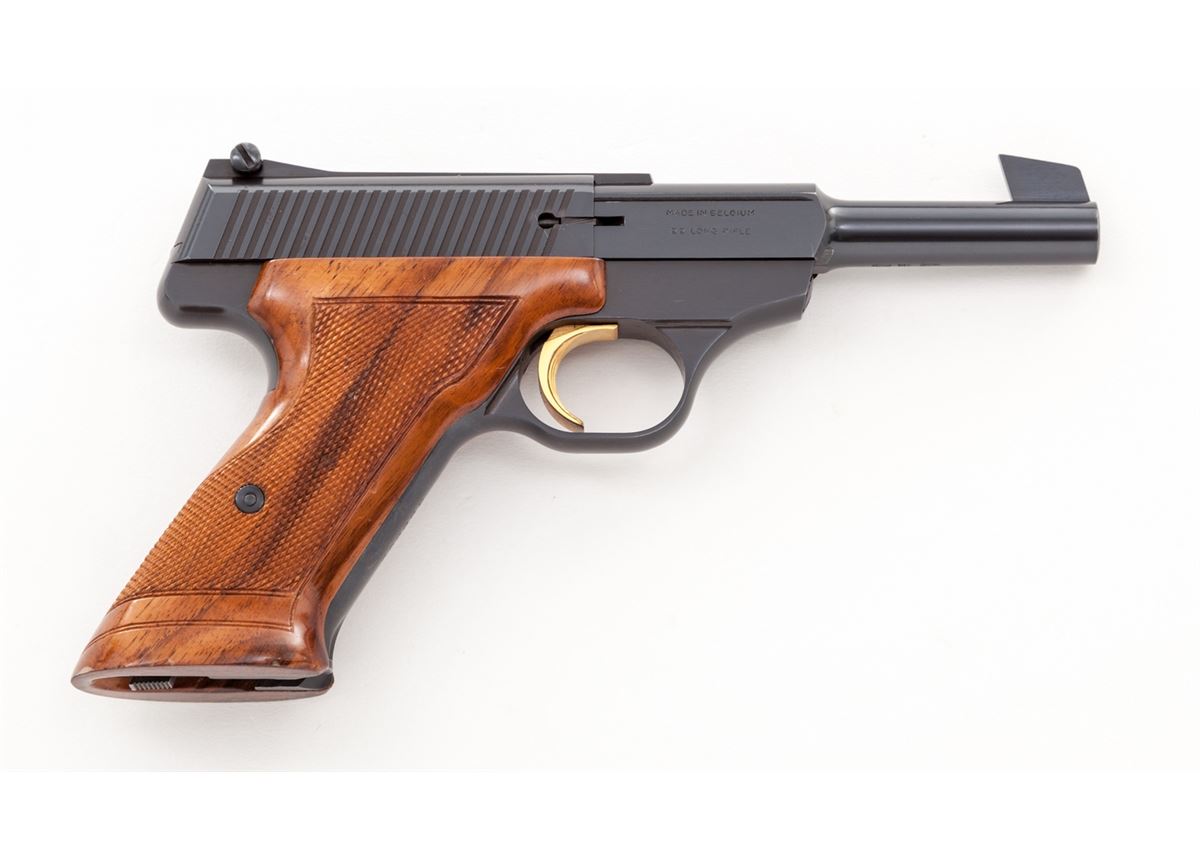 Browning Challenger Semi-Automatic Pistol, #3999U2, .22 LR cal., 4-1/2'' barrel, blue finish, gold trigger, factory checkered walnut grips, in original black & red plastic box. Condition is excellent showing just the lightest marks from handling. Est.: $450-$600. (C&R/PPT)