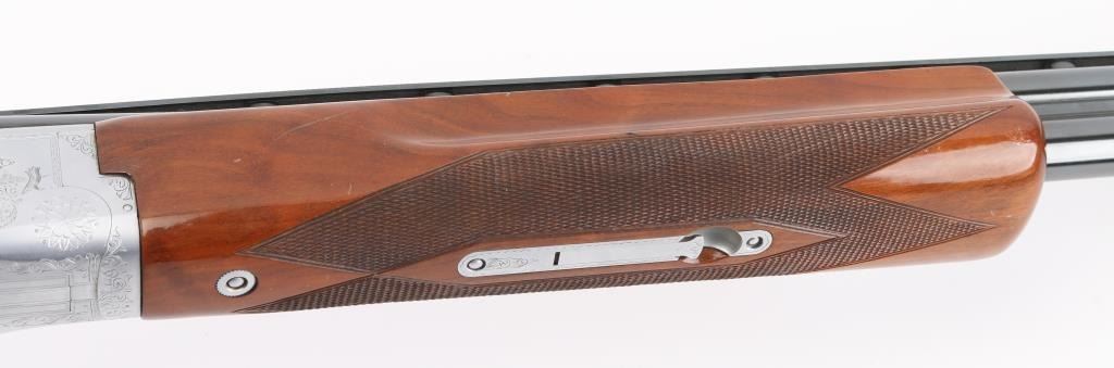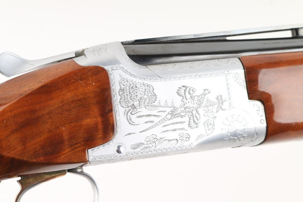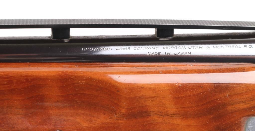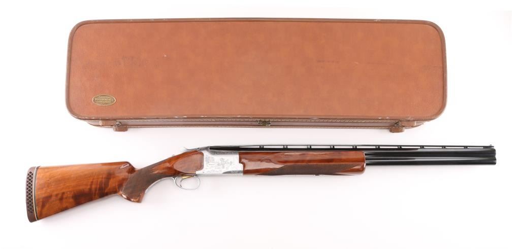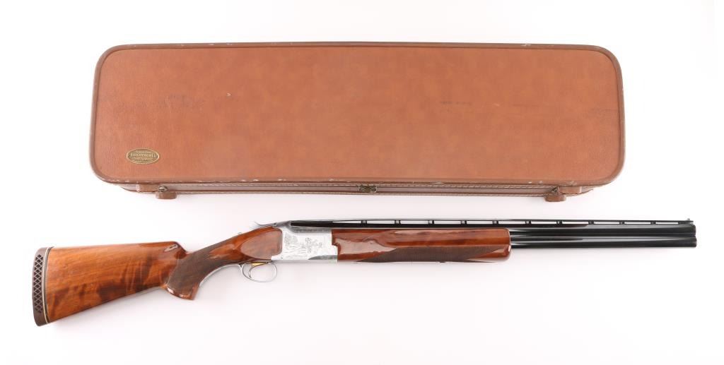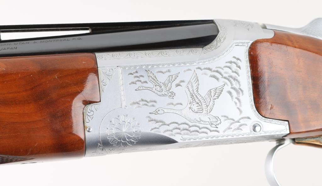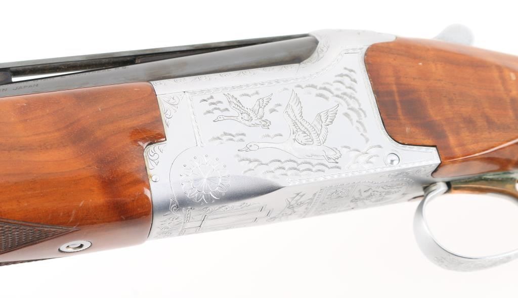 Grade II Skeet. Japanese made by Miroku under/over double barrel shotgun chambered for 2 3/4" .12 gauge shells. Features high polish blued 26" vent rib barrels, white Bradley bead front sight, small white mid bead, single gold trigger, sliding tang safety/barrel selector, full coverage floral scroll engraving on the coin-finished receiver with Geese in flight on the left of the receiver, Pheasant in flight. Quail & Pointer on bottom, finely checkered, highly figured, high gloss forend and pistol grip shoulder stock with vented factory butt plate. Bores are excellent/bright: Wood, and metal finish are excellent with some very minor scratches, slight muzzle wear. 14-1/4" Length of Pull. Fixed chokes gauge IC on top, and M on bottom barrels. Manufactured 1979. Comes with the original Browning brown leather form fitted case with manual. Condition is NRA Excellent Modern Firearm