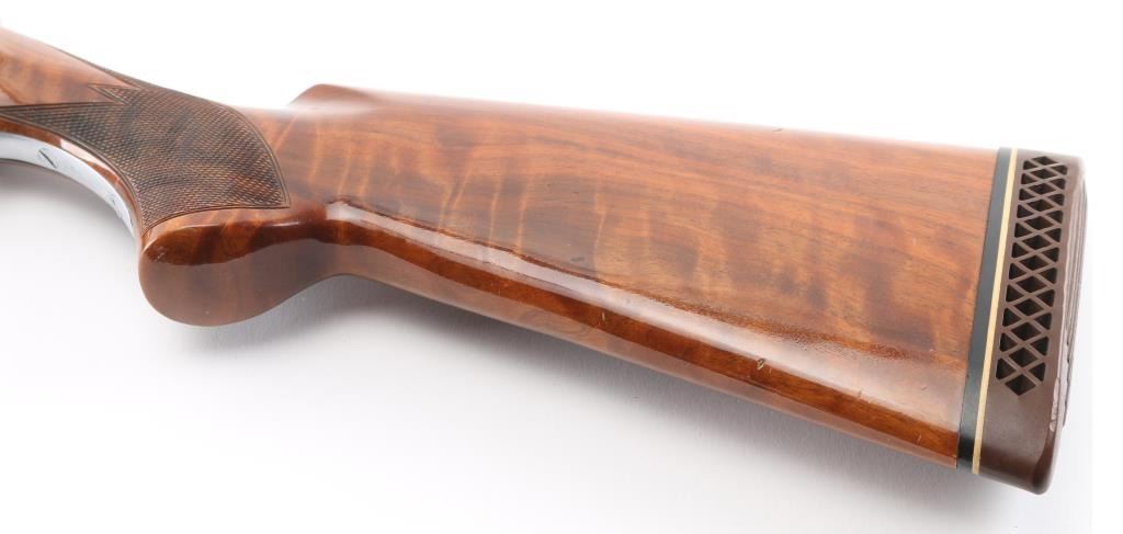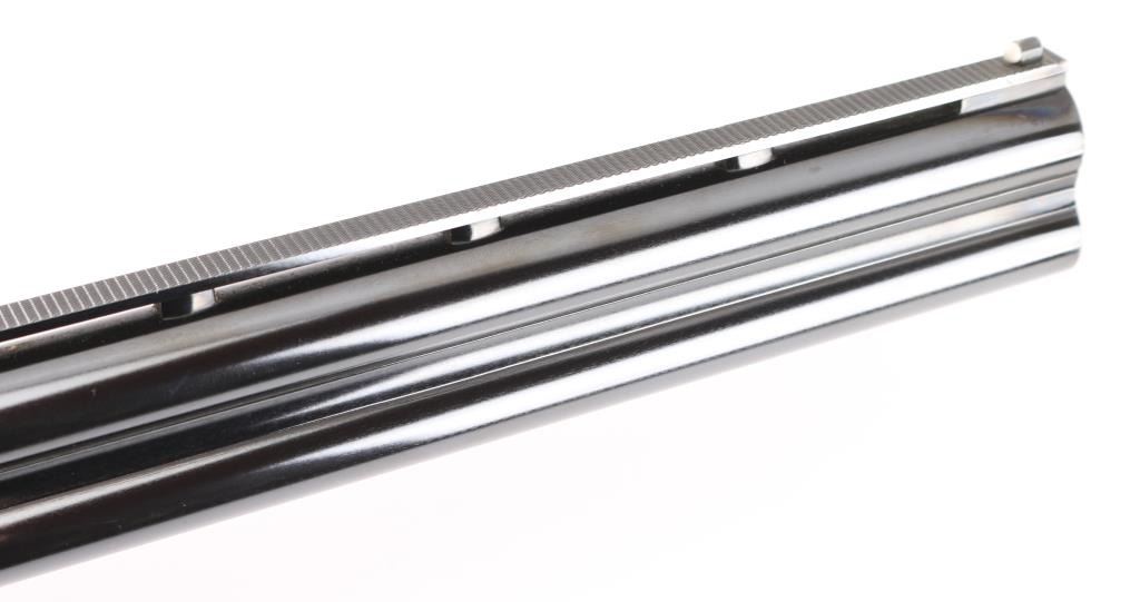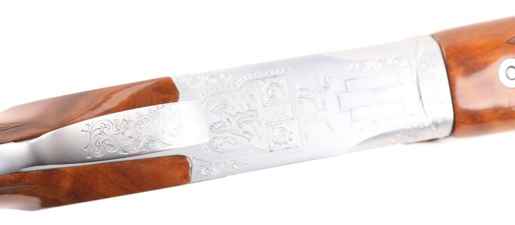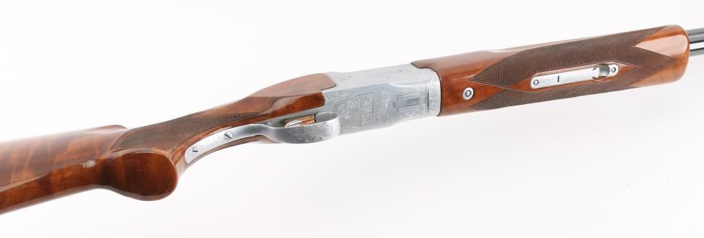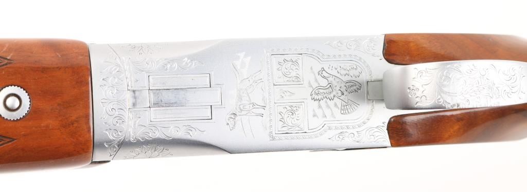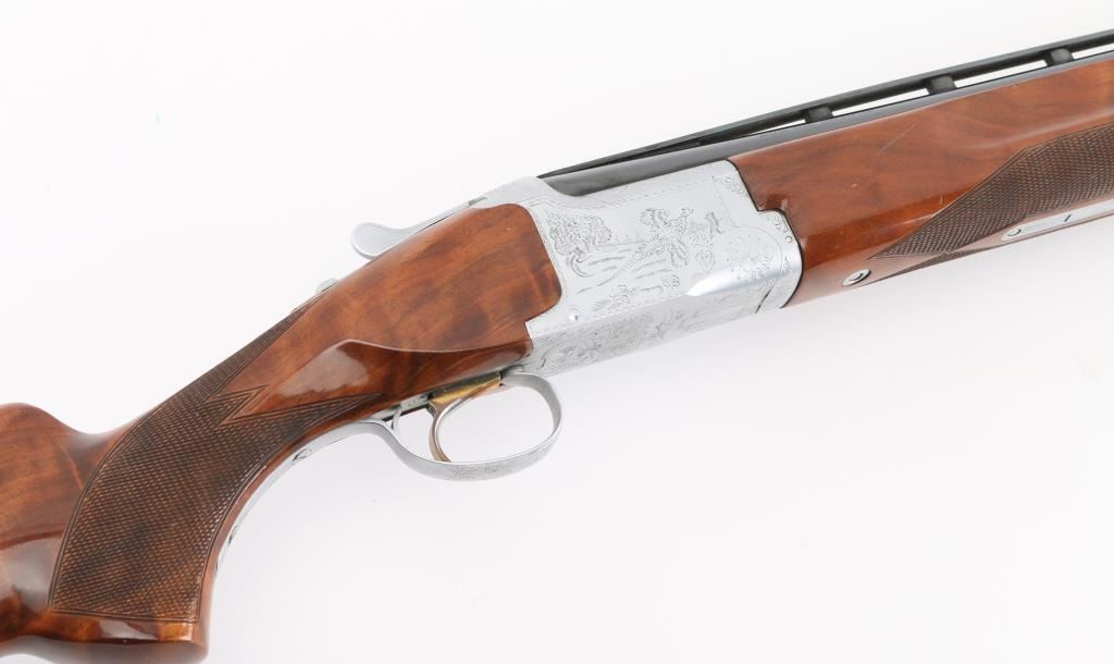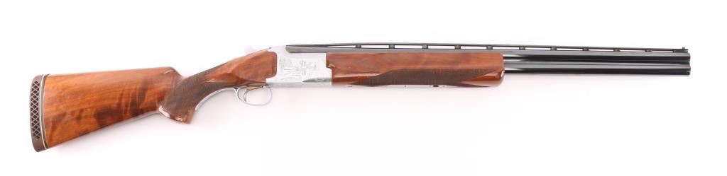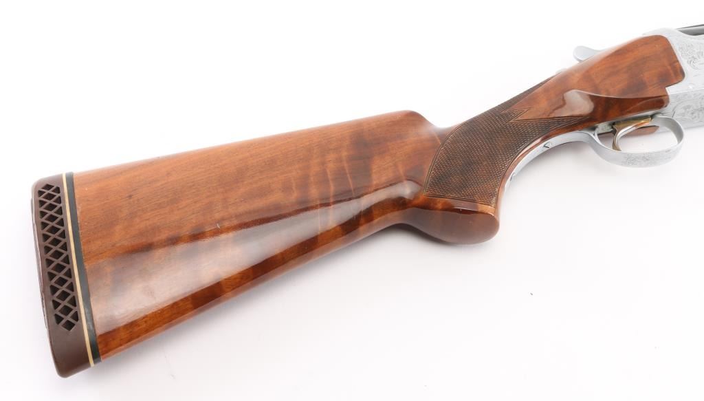 Grade II Skeet. Japanese made by Miroku under/over double barrel shotgun chambered for 2 3/4" .12 gauge shells. Features high polish blued 26" vent rib barrels, white Bradley bead front sight, small white mid bead, single gold trigger, sliding tang safety/barrel selector, full coverage floral scroll engraving on the coin-finished receiver with Geese in flight on the left of the receiver, Pheasant in flight. Quail & Pointer on bottom, finely checkered, highly figured, high gloss forend and pistol grip shoulder stock with vented factory butt plate. Bores are excellent/bright: Wood, and metal finish are excellent with some very minor scratches, slight muzzle wear. 14-1/4" Length of Pull. Fixed chokes gauge IC on top, and M on bottom barrels. Manufactured 1979. Comes with the original Browning brown leather form fitted case with manual. Condition is NRA Excellent Modern Firearm