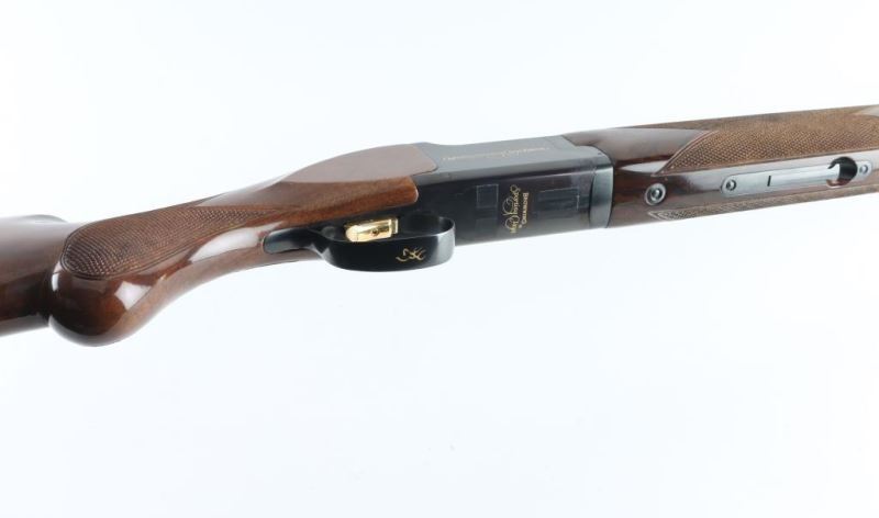 "Lightning Sporting Clays Edition" Over/Under shotgun made in Japan for Browning Arms Co, Morgan UT. Accepts up to 3" shells. Features high polished blue finish, urethane finished butt & forend, checkering at wrist & forend, 30" ported vent rib barrel, screw-in choke tubes (Mod/IC installed), Bradley type front white polymer bead, white polymer mid bead, solid rubber butt pad, selective ejectors. Single inertia trigger is selectable at tang safety. Bore is very good condition. Metal retains 95% blued finish with handling marks. Wood is very good or better condition with scratches & dings. Gold color script on receiver sides "Lightning Sporting Clays Edition". Includes Browning luggage type hard case with additional Mod & IC choke tubes. Condition is NRA Excellent *** Modern Firearm ***